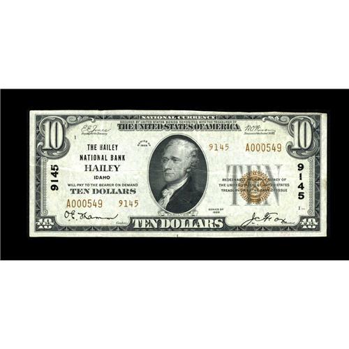 <B>Hailey, ID</B></I> - $10 1929 Ty. 2 <B>The Hailey NB</B></I> Ch. # 9145<BR>A very scarce note which is just as difficult to obtain in small size as large. Type Twos are exceptionally scarce, with this one of only two known, the other of which is graded "Good." Bright <B>Very Fine+.</B></I><BR><BR><b>Shipping:</b> Coin/Currency (<a target="_blank" href="http://www.heritageauctions.com/common/shipping.php">view shipping information</a>)