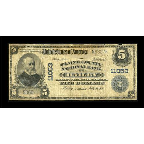 <B>Hailey, ID</B></I> - $5 1902 Plain Back Fr. 606 <B>The Blaine County NB</B></I> Ch. # 11053<BR> This was Hailey's other third charter issuer, lasting only eight years before limping into oblivion in late 1925. Only five notes are recorded from here in the census, with this the second one we've had the opportunity to handle in thirty years. <B>Good-Very Good</B></I> with a repair noticed along the top at center and some margin roughness.<BR><I>From The Kansas City Collection.</B></I><BR><BR><b>Shipping:</b> Coins & Currency (<a target="_blank" href="http://www.heritageauctions.com/common/shipping.php">view shipping information</a>)