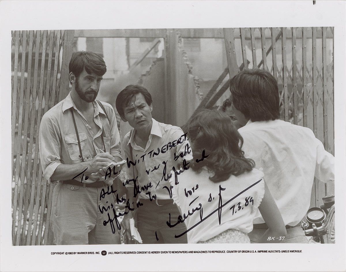 Cambodian-born actor (1940–1996) who won an Academy Award for his role in the 1984 film The Killing Fields and was later slain on the streets of L.A. Glossy 10 x 8 publicity photo for The Killing Fields, signed and inscribed in black felt tip “Al Wittenbert, all my very best wishes, love, respect, and affection to you. Love, Haing S. Ngor 7.3.89.” In fine condition.