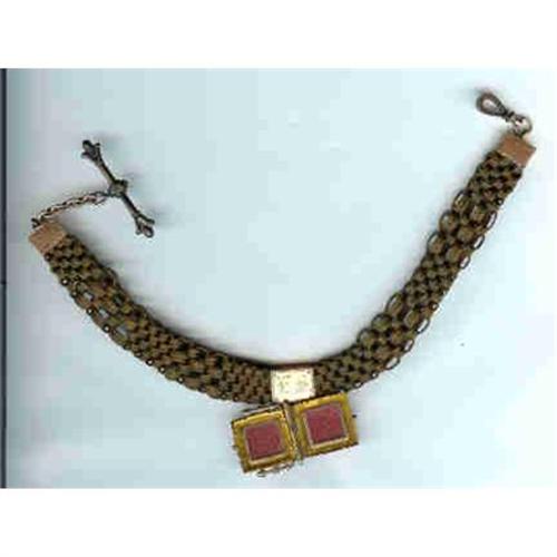 Made for and worn by Emil Schumann Snr who died in 1870. Worn by his son Emil Schumann Jnr. who was born in Eastern Prussia in 1859, Married Augusta Miller in 1880, moved to Wisconsin in 1889. Died in 1910. Augusta lived until 1945. 11" total length,7/8" locket holds two pictures(or hair) in tiny frames. The "T" bar is very pretty. All findings are gold filled, hand made hair chain as seen by the variations in the weaving.