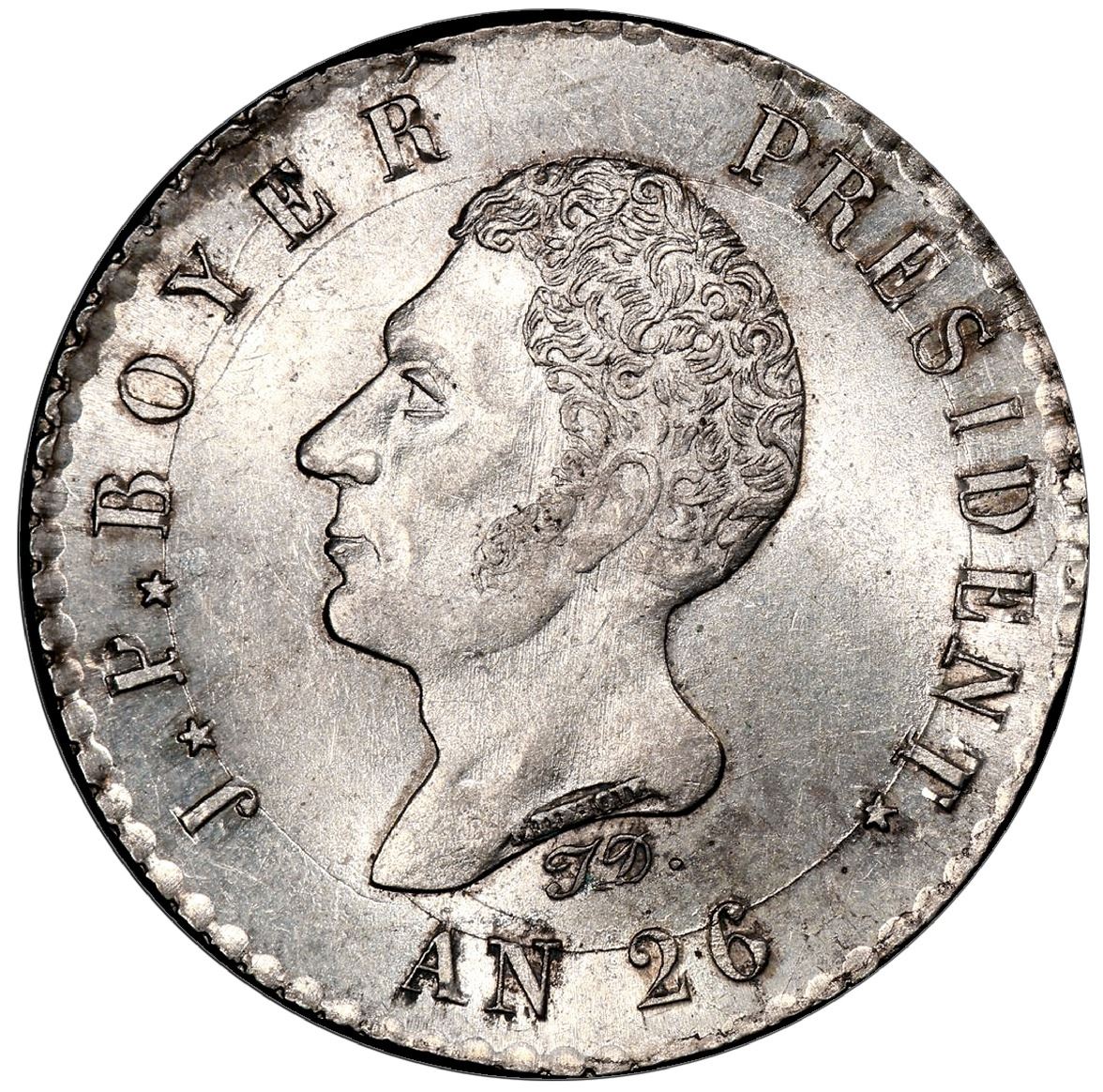 Haiti, 100 centimes, An 26 (1829), Boyer, PCGS MS63 ("top pop"), ex-Pat Johnson. KM-A23. Bold strike with fully detailed bust but slightly weak center on reverse, complete circular die-crack through bottom of obverse legend, nice luster and incipient golden toning, tied with one other for finest known in the PCGS census. Pedigreed to the Pat Johnson Collection (stated on label). Please use this link to verify the certification number