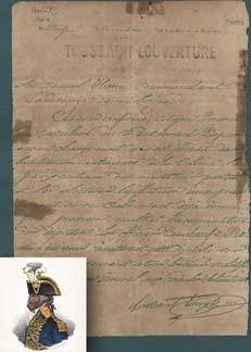 Rare broadside, in French, of a letter by Toussaint Louverture to French General Jean Herne. Louverture was Governor General of Saint Domingue, Haiti's name as a then French colony. 7.25'' x 10.5'' document translates in part, ''…peace continues to be maintained all over and the calm…election has already given the first results…'' Dated 1799, five years before Toussaint would die in a French jail and Herne would sign Haiti’s Act of Independence from France. Show-through in margin from tape on verso and rough right edge. Good condition.