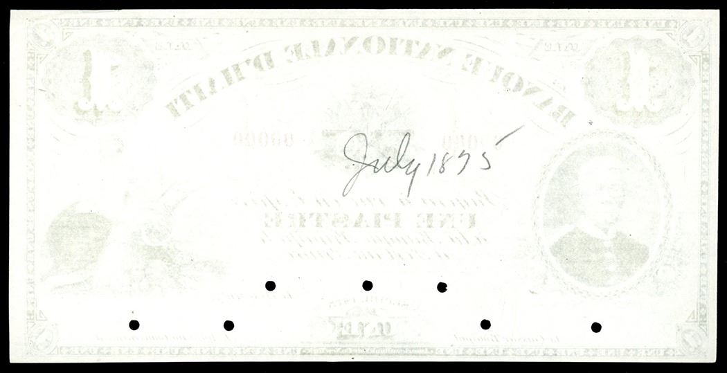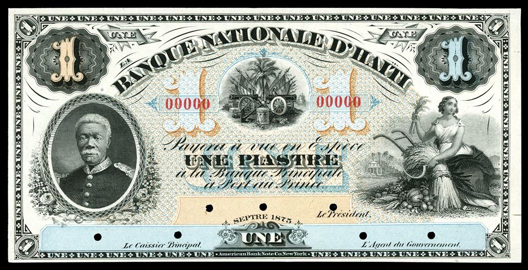 Haiti, Banque Nationale, 1 piastre front proof, 1875. Pick-70p. Uniface front proof made by the ABNCo with vignettes of Haitian President Michel Domingue at left and an allegorical woman representing agriculture to right with colorful blue and orange undertones. AU with seven punch hole cancellations.