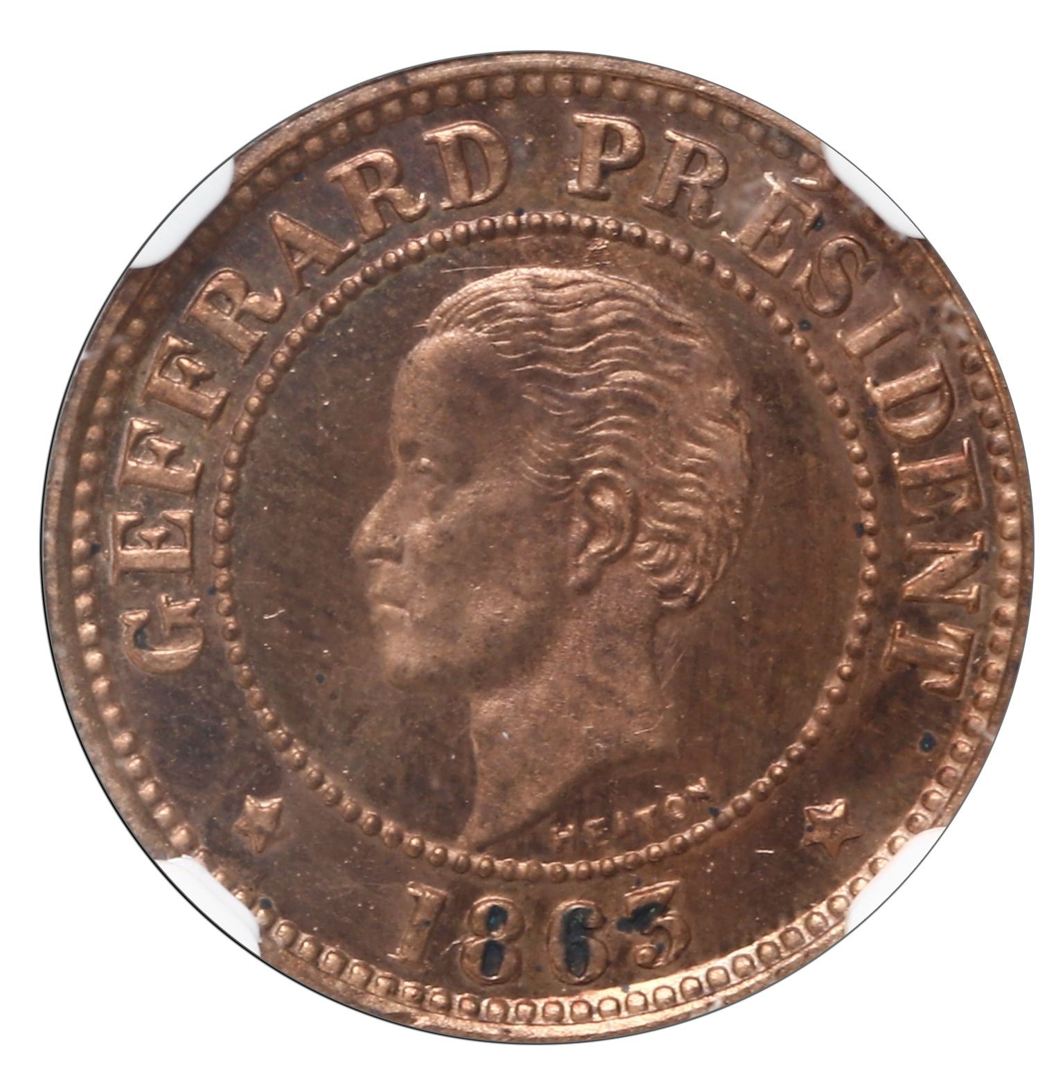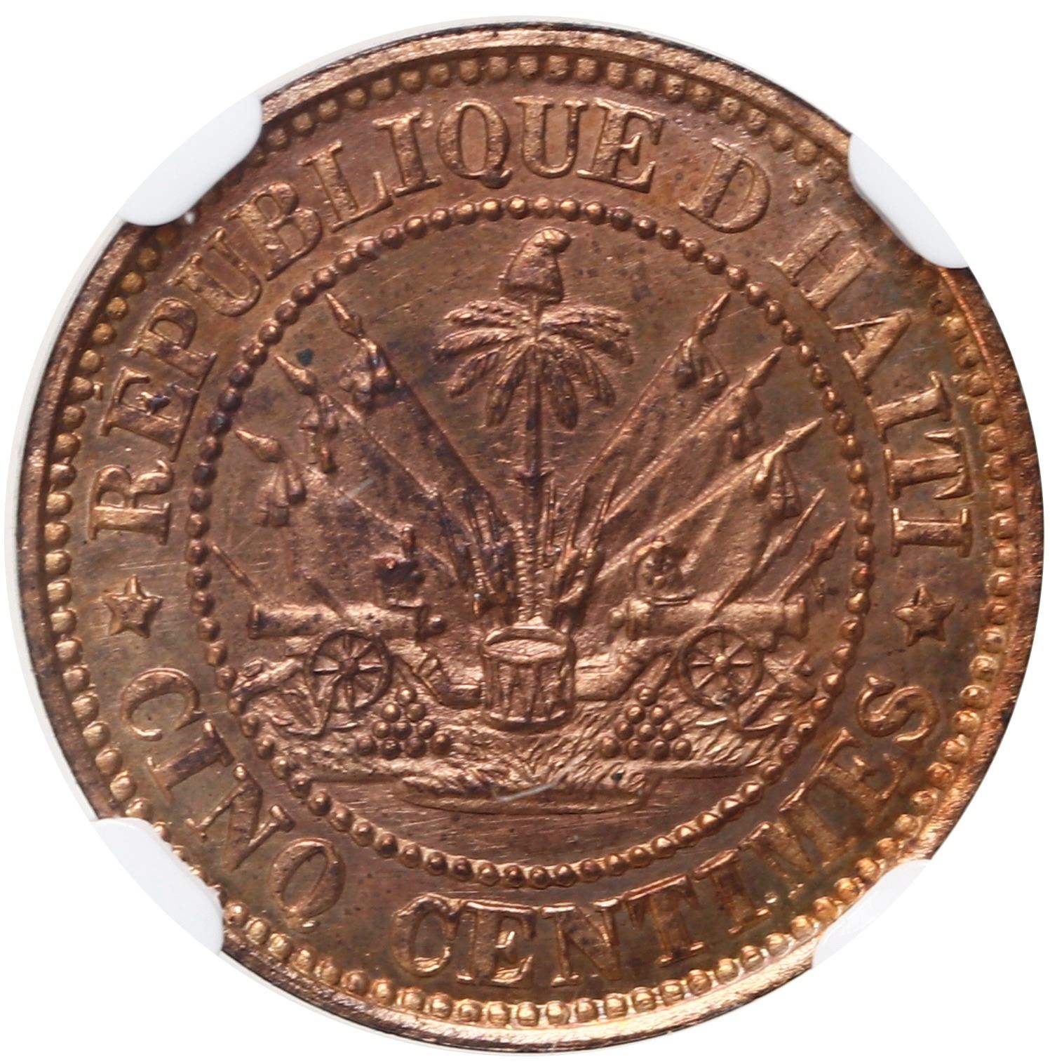 Haiti (struck in England), copper proof 5 centimes, 1863-HEATON, NGC SP 64 Red Brown. KM-40. Brilliant proof with mirror fields showing ample red hues. Please use this link to verify the certification number