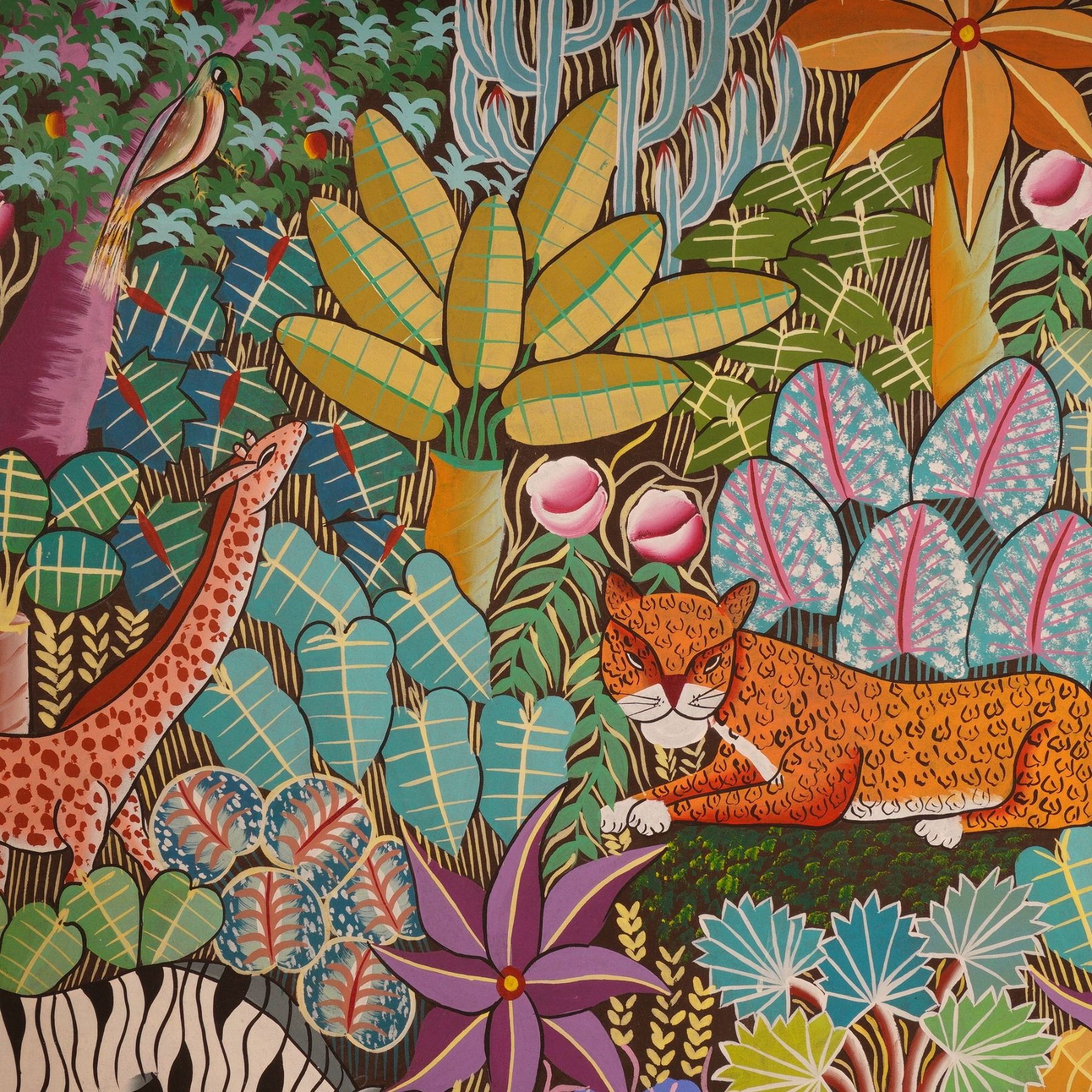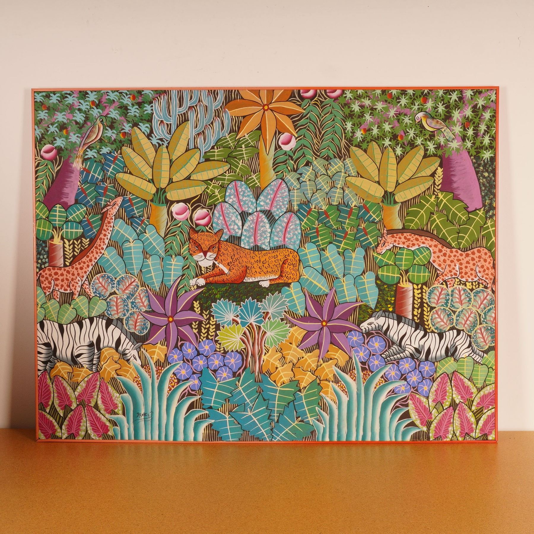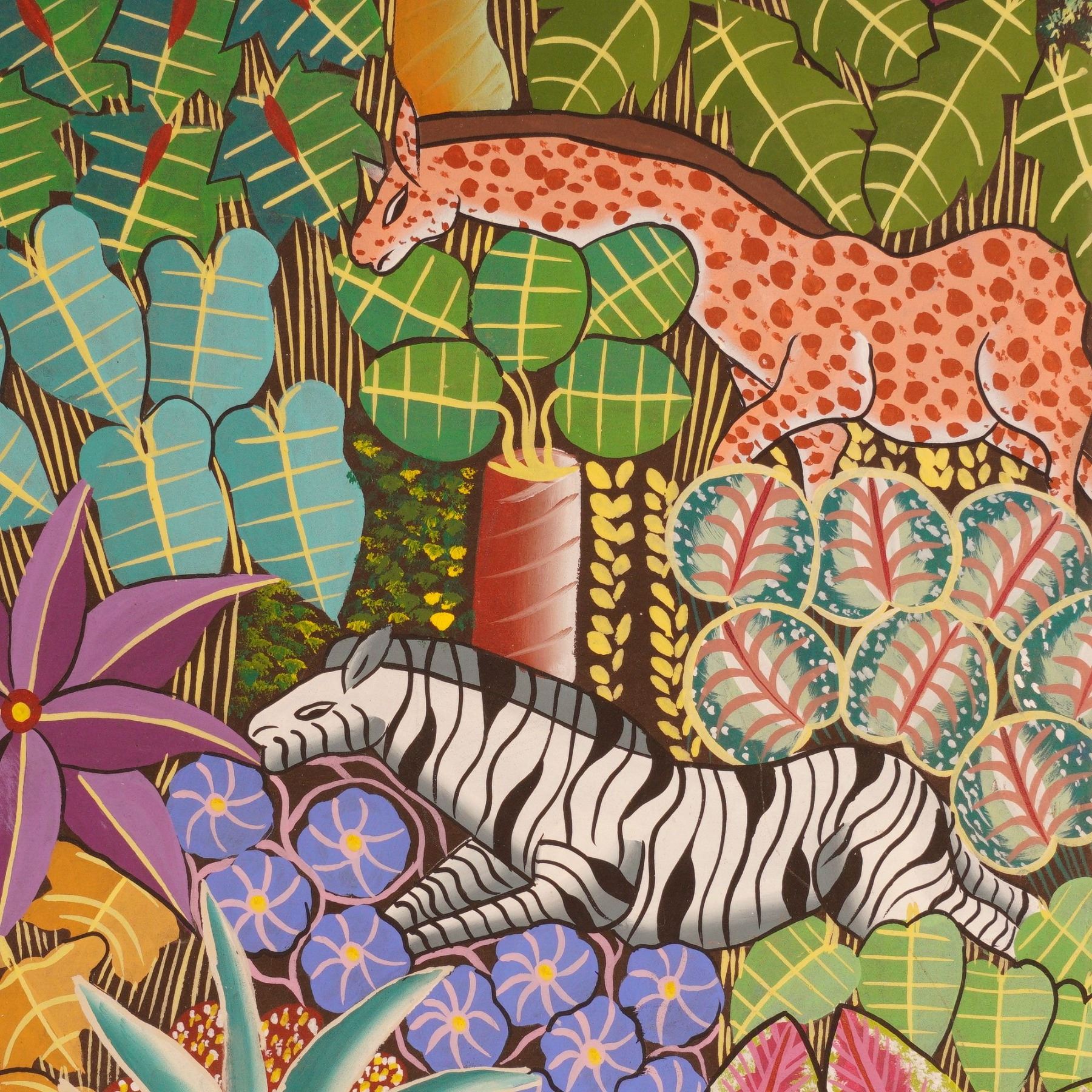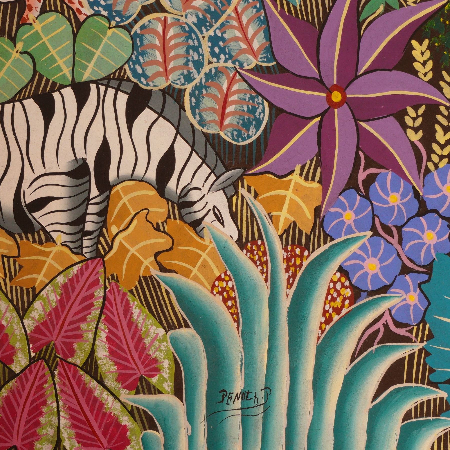Vibrant Haitian jungle scene painting signed by Penoth D, depicting a lush tropical forest teeming with life. The composition features a resting leopard surrounded by zebras, giraffes, exotic birds, and an abundance of stylized foliage in vivid greens, blues, and purples. Executed with bold color contrasts and intricate patterns, the work captures the vitality and rhythm typical of Haitian naive art. A striking example of Caribbean folk expression that celebrates the harmony of wildlife and nature through dynamic composition and color.