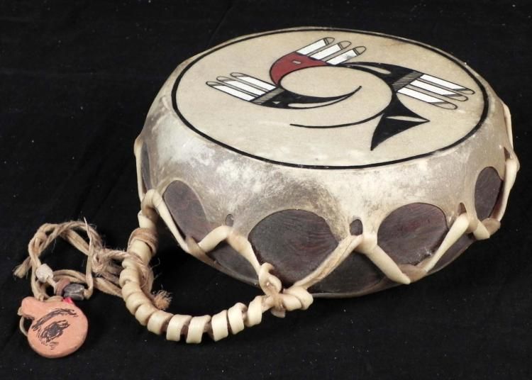 This is a Haitian tribal drum, painted on one side with an abstract figure in black, white and red. The drum has an animal hide skin and ropes, wooden edge tied with jute rope, handle, and clay beads on rawhide, designed to hit the drum when shaken. Also included is a stick made of a branch and leather. The drum dimensions are 3 1/4" high by 9" in diameter. It is in very good condition, and playable. It was purchased on a trip in 2005. * This is an attractive drum for play or display.