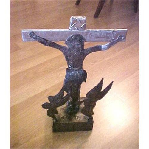 The statue represent Jesus on the cross with 2 angles on the front one angel is carying flowers an the other one is blowing on a trumpet. The Statue is 18.5" tall x 12.5" wide x 5.25" deep. The artist has signed in front of the cross. The statue was purchased in Haiti from the artist a few years ago. </font>