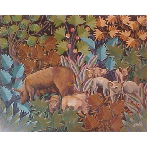 About the artist: Alix George Calixtes was born in Port-au-Prince, Haiti in 1943. He began painting at an early age. He was influenced early by the legendary Haitian master Gesner Abellard. He is best known for works titled "Birds". His works were prominently featured in many exhibitions both in Haiti and abroad. (Signes A.G. Calixtes)