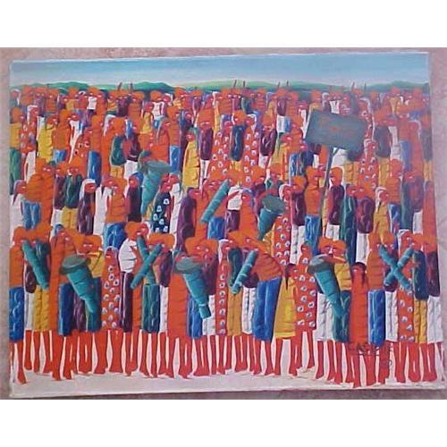 About the Artist: CASIMIR LAURENT was born in the late 1920’s in Anse a Veau, in Southern Haiti. In 1946, Casimir moved to Port-au-Prince, where he worked at the Art Center. He started to draw by himself and was noticed by Dewitt Peters, who asked Dieudonne Cedor to guide him. In 1950, Casimir joined the Foyer des Arts Plastiques. He later opened his own studio and trained other artists. His children Ernst and Gerald also Paint. He signs his painting with only his first name “Casimir.” A naïve artist, he paints mostly crowds at markets and cockfights. He is the most imitated painter.