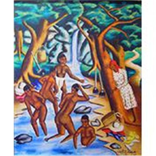 Bathers by Castera Bazile. Circa 1951. Oil on Masonite. Measurements are 19.5 x 15.5. Artwork is signed and dated by the master. Painting is in very good condition.