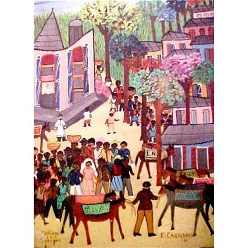 About the Artist: Etienne Chavannes was born on July 15, 1939 in Cap Hatien. In 1967 he went to Cap Haitien to study with Philome Obin. Within six months he realized that he was inspired by different forces than Obin, and left to develop his own style. ?I don't paint things as I see them with my eyes, but as I see them with my mind", he says. Nehemy Jean, a recognized painter, encouraged him and gave him some advice. Chavannes went back to Cap Haitien to refine his style. He joined the Centre d?art in 1971.