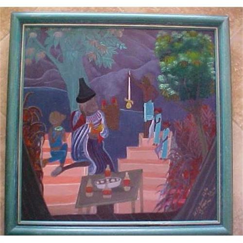 About the Artist: Lafortune Felix was born in 1933 in Pontsonde, near St. Marc and became a houngan (voodoo priest in 1958. in 1976 Pierre Monosiet the then assistant of Dewitt Peters and Curator of the musée d'art haïtien du collège Saint Pierre de Port-au-Prince after noticing the outside walls of his hounfor tht Lafortune Felix had painted, encouraged the artist by giving him some painting material and purchased his first paintings. Since then, Lafortune Felix became a painter. Lafortune Felix exclusively paints with acrylique, religious subjects either voodoo or christian.