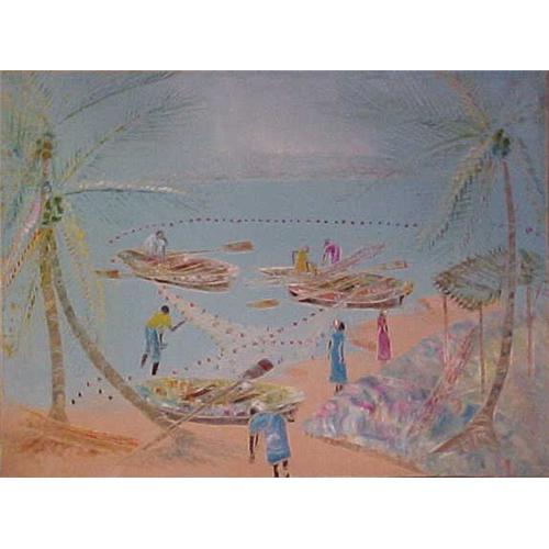 Nicolas Dreux was born on March 10, 1956 in Port-au-Prince, Haiti. He began to paint as a student of Calixte Henri in 1973. He adopted his master?s technique of painting with razor blades, laying on the paint thick in spots and scraping it to transparency elsewhere. After this he accents some elements of the painting with the corner of the blade. An advanced naïve painter, Dreux paints landscapes crowded with people and seascapes.