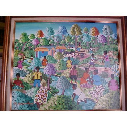 Haitian Painting in acrylic on Canvas by Rodrigue Mervilus. The Painting is 20"x24" and is professionally framed. The painting is in as a scratch on the top which can easily be touched up, and does not distract from the beauty of the artwork.
