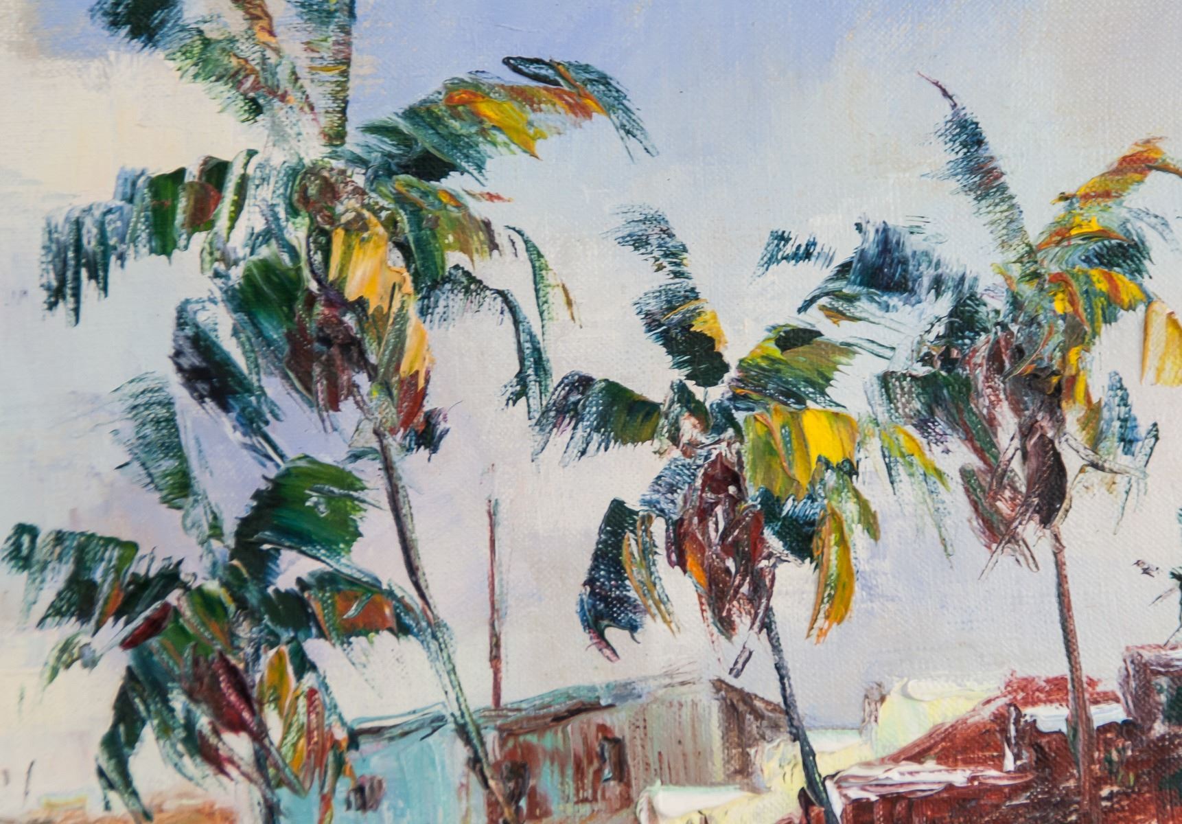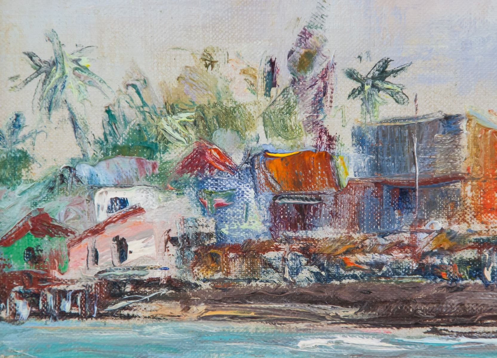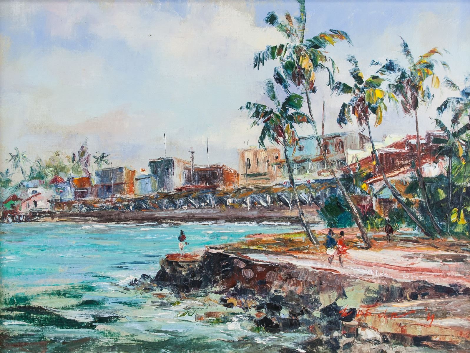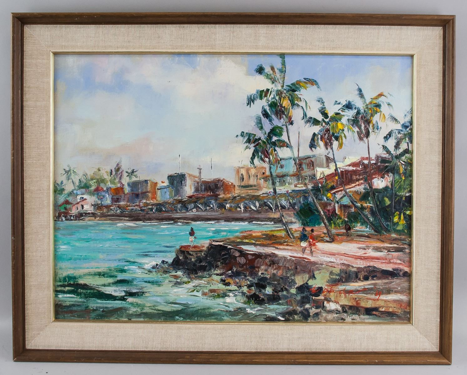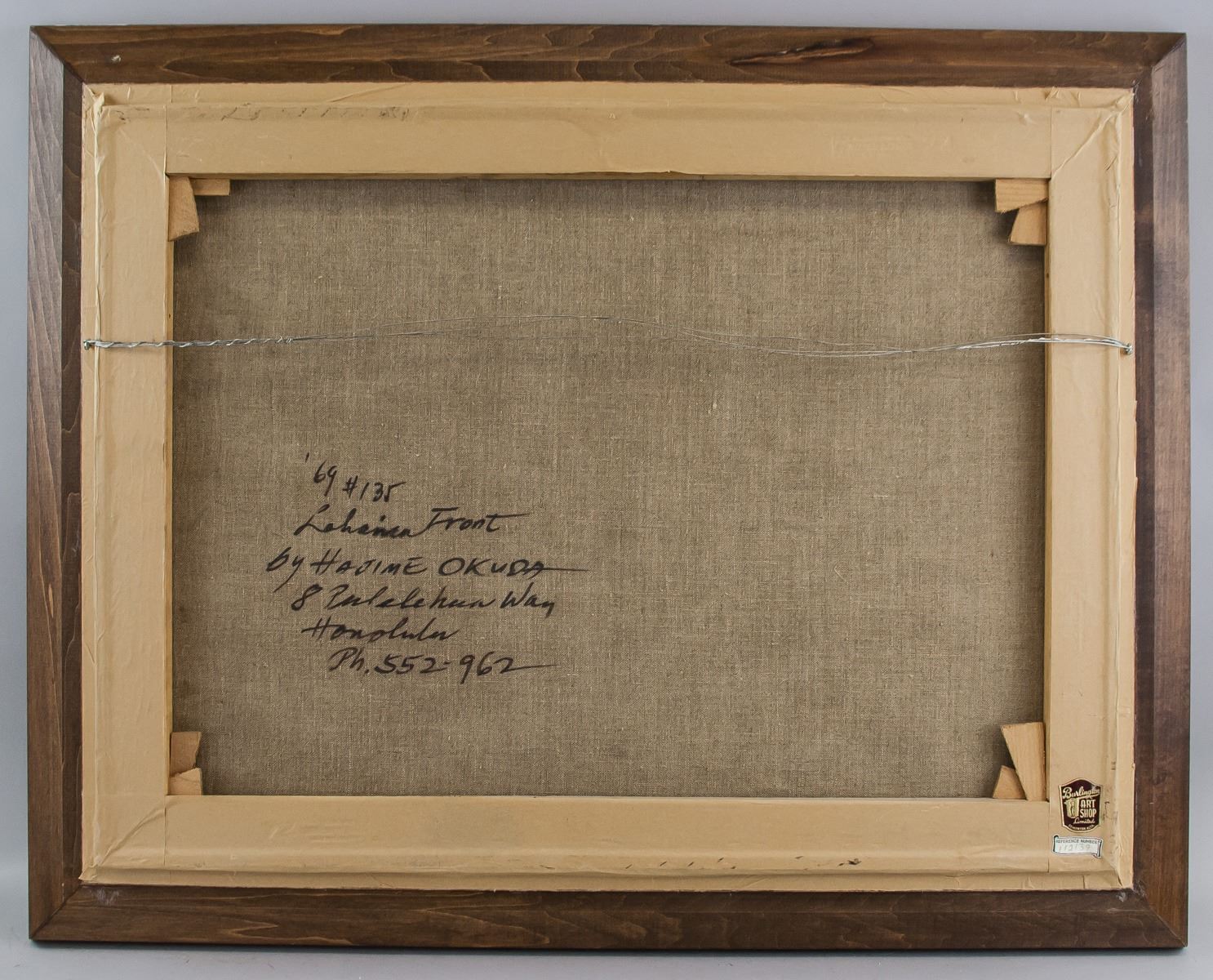 Oil on canvas, framed. Featuring a landscape scene of coastline and beach. Signed on the lower right corner and inscribed '69 beside signature. On verso, inscribed '69 #135 Lahaima Front / By HAJIME OKUDA / 8 Pulelehua Way / Honolulu / Ph. 552-962. Attributed to Hajime Okuda (1906-1992, American). 46 x 61.5 cm (18.1 x 24.2 inches). Framed size: 57 x 72.5 cm (22.4 x 28.5 inches)