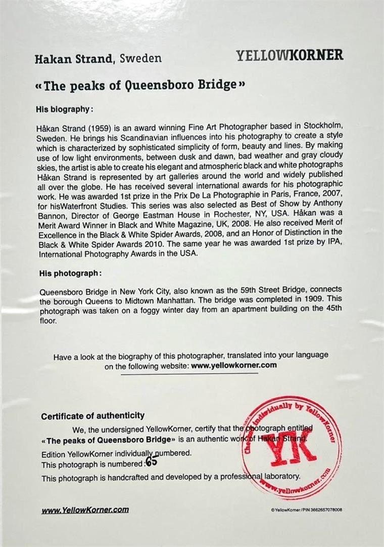 Hakan Strand Sweden The Peaks of Queensboro Bridge YellowKorner Certified Photograph. Certificate of Authenticity from YellowKorner affixed to the back. Matted Dimensions 16"x20". Protected with Clear Mylar Sleeve.