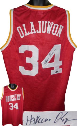 Hakeem Olajuwon played the center position from 1984 to 2002 for the Houston Rockets and Toronto Raptors. He led the Rockets to back-to-back NBA championships in 1994 and 1995. In 2008, he was inducted into the Basketball Hall of Fame. Listed at 7 ft 0 in Olajuwon is considered one of the greatest centers ever to play the game. Hakeem Olajuwon has hand signed this Houston Rockets Red TB Prostyle Jersey. Schwartz Sports Hologram and Certificate of Authenticity from Athlon Sports.
