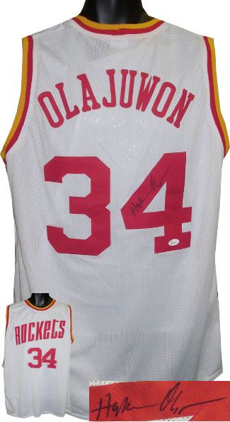 Hakeem Olajuwon played the center position from 1984 to 2002 for the Houston Rockets and Toronto Raptors. He led the Rockets to back-to-back NBA championships in 1994 and 1995. In 2008, he was inducted into the Basketball Hall of Fame. Listed at 7 ft 0 in Olajuwon is considered one of the greatest centers ever to play the game. Hakeem Olajuwon has hand signed this Houston Rockets White Prostyle Jersey. James Spence Hologram and Certificate of Authenticity.