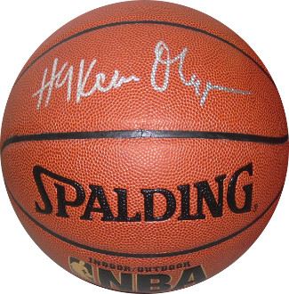 Hakeem Olajuwon played the center position from 1984 to 2002 for the Houston Rockets and Toronto Raptors. He led the Rockets to back-to-back NBA championships in 1994 and 1995. In 2008, he was inducted into the Basketball Hall of Fame. Listed at 7 ft 0 in Olajuwon is considered one of the greatest centers ever to play the game. Hakeem Olajuwon has hand signed this NBA Indoor/Outdoor TB Basketball. Schwartz Sports Hologram and Certificate of Authenticity from Athlon Sports.