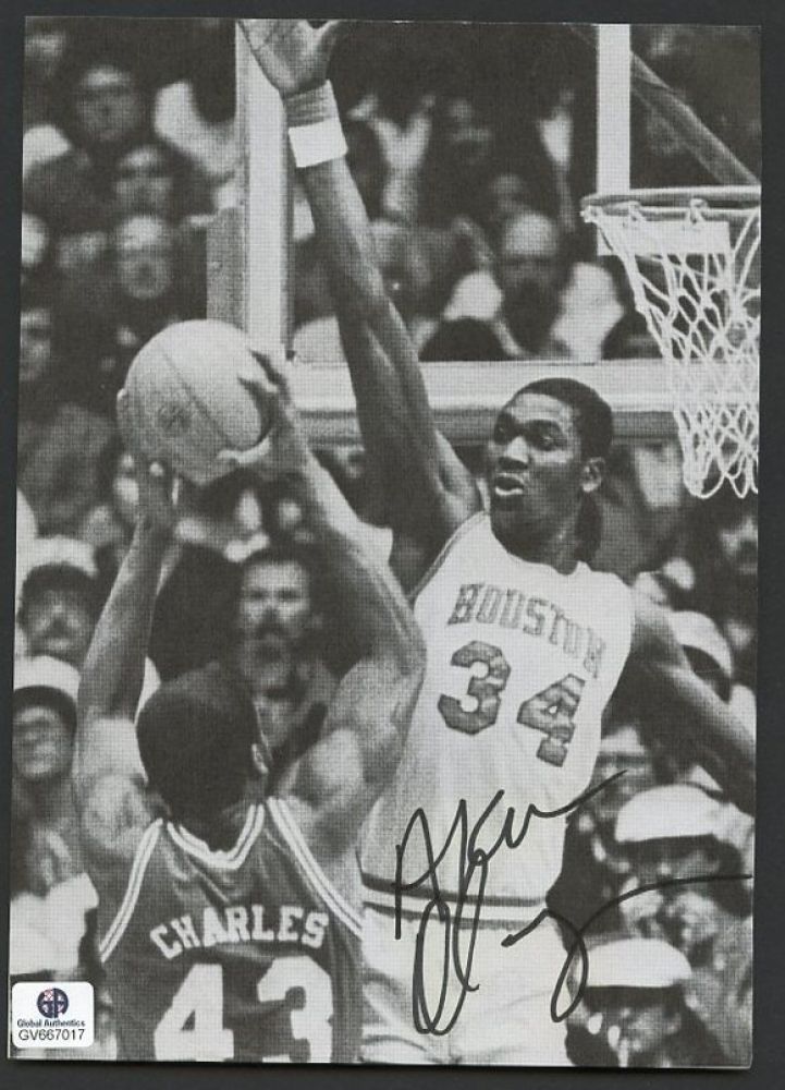 Photo measures approximately 5.75" x 8" in size and is hand-signed in black felt tip pen by Hakeem Olajuwon (HOF). Autograph includes a Global Authentics COA for authenticity purposes.
