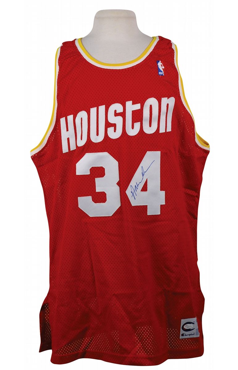 Official Champion replica Houston Rockets basketball jersey, with sewn on letters and numbers, signed in blue felt tip on the number on the front. In very fine condition. Accompanied by a letter of authenticity from James Spence.
