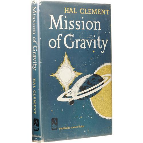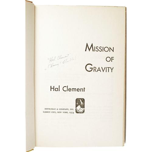 <B>Hal Clement Harry Clement Stubbs : Signed<I> Mission of Gravity.</B></I></B></I> (New York: Doubleday & Company, Inc., 1954), first edition, 224 pages, signed by the author on the title page "<I>"Hal Clement"/(Harry C. Stubbs)</B></I>", jacket design by Joe Mugnaini, yellow boards with blue titles, 8vo (5.75" x 8.5"), fine in a near fine unclipped jacket. Number 15 on David Pringle's list of the 100 Best Science Fiction novels. <I>From the Ventura Collection.</B></I><BR><BR><b>Shipping:</b> Books & Catalogs (<a target="_blank" href="http://www.heritageauctions.com/common/shipping.php">view shipping information</a>)