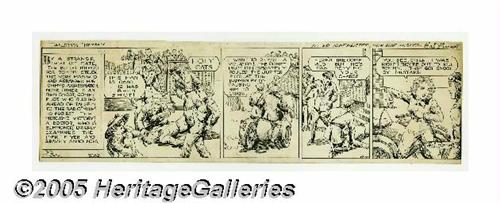 <B>Hal Forrest - Tailspin Tommy Daily Comic Strip Original Art (Bell Syndicate, undated).</B></I> By a strange twist of fate, the bullet intended for Tommy struck Ben Snoot, the very man who had arranged for Tommy's assasination! Hal Forrest keeps the action going, and the lines brisk, in this daily titled "The Danger is Not Over!," and dated October 6 (year unidentified). This beautifully rendered piece has an image area of 26" x 7". There is some overall tanning to the work, otherwise the art is in Excellent condition.