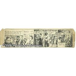<B>Hal Forrest - Tailspin Tommy Daily Comic Strip Original Art (Bell Syndicate, undated).</B></I> Betty-Lou uses all her feminine charms to lure Bently away from jealous Rita, so she can ask him a few questions about the death of Mrs. Bently. She's walking a thin line between burning curiosity and the fury of a woman scorned. Forrest's drawings have the effect of a woodcut print, with their precise textures and accomplished shading. A fabulous 26" x 7" extravaganza dated October 5, though the year is not apparent. The art holds up well, with some minimal aging apparent along the extreme edges and a small discolored paste-up in panel two, but overall in Very Good condition. <I>From the collection of Gill Fox.</B></I>
