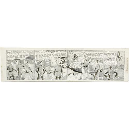 <B>Hal Forrest - Tailspin Tommy Daily Comic Strip Original Art, dated 1-2-33 (Bell Syndicate, 1933). </B></I> With its high-flying adventure and delightful "good girl" scenes, this suspense-filled <I>Tailspin Tommy </B></I>daily by Hal Forrest is beautifully rendered with a "cross hatched" pen technique. This sensational strip has an image area of 26" x 6.75", and the art is in Excellent condition. <BR><BR><b>Shipping:</b> Flat Material, Large (<a target="_blank" href="http://www.heritageauctions.com/common/shipping.php">view shipping information</a>)