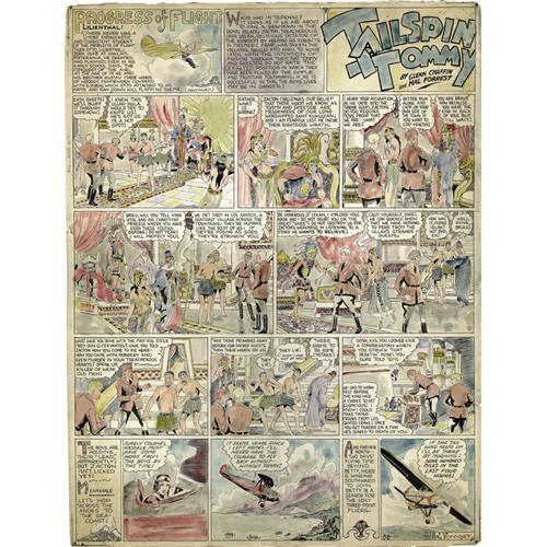 <B>Hal Forrest - Tailspin Tommy Hand Colored Sunday Comic Strip Original Art, dated 6-21 (Bell Syndicate, circa 1931).</B></I> Tommy and Skeets are embroiled in the treacherous politics of the Tolmayan court. This Sunday is filled with thirties atmosphere: exotic locales, scantily clad maidens, and those magnificent flying machines! This hand colored Sunday is numbered #88, and Jerry Weist's <B>The Comic Art Price Guide</B></I> notes, "Only the first 150 Sunday pages are hand-colored by creator Hal Forrest." The factoid panel, "Progress of Flight," features the pioneering inventor, Otto Lilienthal. The image area of this spectacular Sunday measures 22.5" x 28.75", and the art is in Very Good condition.
