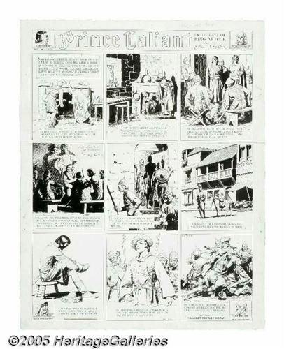 <B>Hal Foster - Prince Valiant Sunday Comic Strip Original Art, dated 11-5-39 (King Features Syndicate, 1939).</B></I> Hal Foster's magnificent draftsmanship shines in <I>Prince Valiant</B></I> Sunday #145. In this episode, Val joins a band of liberators who plot to overthrow the cruel tyrant, Piscaro. Soon after, even disguised as a hun, Val is recognized by Piscaro's minions, and the final panel featuring his struggle against capture is a classic shot of the proud warrior in battle. A special treat are the four portraits of the Liberators at each corner of the strip. Hal Foster inscribed and signed the art in panel four. The image area of the entire Sunday measures approximately 26" x 34.5", and each incredibly detailed panel measures approximately 8" x 10". The page was cut between panel tiers one and two. The art has had moderate restoration, and the title lettering is a recent replacement, otherwise the art is in Excellent condition.