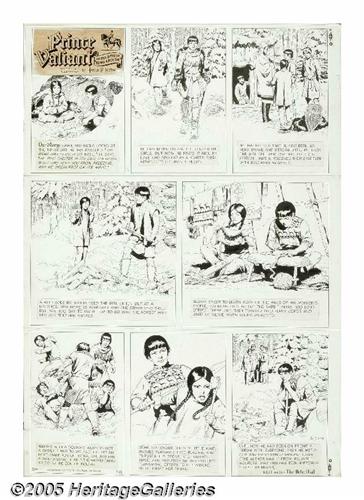 <B>Hal Foster - Prince Valiant Sunday Comic Strip Original Art, dated 2-13-66 (King Features Syndicate, 1966).</B></I> In Sunday #1514, Hatha, the bold son of Prince Valiant's Viking comrade Boltar, makes a visit to his mother's homeland -- the Old World. Hatha has struck up an acquaintance with Dawn, a Native American beauty, and soon he is involved in a hot and heavy romance! Hal Foster's experience as an outdoorsman brings authenticity to these scenes of the wintry woodland. Each of the Sunday's three panel tiers were cut from the page, and have since been mounted onto a backing board; otherwise the art is in Excellent condition. The image area of the entire Sunday measures approximately 22.75" x 34". Hal Foster pioneered the art of adventure cartooning in 1929, and his work remains the "gold standard!"
