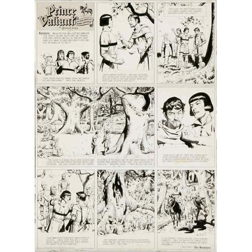 <B>Hal Foster - Prince Valiant Sunday Comic Strip Original Art, dated 8-11-46 (King Features Syndicate, 1946).</B></I> This spectacular "Prince Valiant" Sunday features the Robin Hood-like Hugh-the Fox, as Val enlists Hugh's help in a coming battle against Saxon invaders. The woodland tableau recalls the magnificent forest scenes of 1938's "The Adventures of Robin Hood," starring Errol Flynn. The red lines in panels indicate "color holds," a technique that Foster used very sparingly and to great effect, giving the finished product a more "painterly" look. The linework in this strip here is superb, on a par with the best works of any of the classic illustrators. The Sunday has an approximate image area measuring 24" x 34.5". The strip was cut between panel tiers one and two, and other than a missing lettering correction in panel five, the art is in Excellent condition.