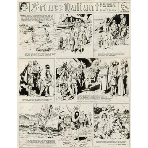 <B>Hal Foster - Prince Valiant Sunday Comic Strip Original Art, dated 7-25-43 (King Features Syndicate, 1943).</B></I> This Prince Valiant Sunday, #337, features many of the hallmarks any Hal Foster fan would have on his "wish-list" -- Vikings, sailing scenes, outstanding figure drawing and panel compositions, a character stamp, and five striking portraits of Val! This Sunday hails from "The Long Voyage to Thule" storyline. Val has just brought Lady Olga and her daughter Katwein ashore, from their shipwrecked vessel, the "Poseidon." This Sunday also features one of the last character "stamps" (Eric the Saxon). The stamp feature ended just two strips later. Hal Foster was elected to membership in Great Britain's Royal Society of Arts, an honor very few Americans can claim. The Duke of Windsor called <I>Prince Valiant</B></I> the "greatest contribution to English literature in the past hundred years." The strip, one of the most successful adventure series of all time, won the prestigious Banshees' "Silver Lady" award in 1952, and the National Cartoonists Society's "Reuben" award in 1957, as well as its "Gold Key" award in 1977. This Sunday has an image area of 26" x 34". The first panel tier was cut from the page (and later rejoined with tape, on the back of the page); otherwise, the art is in Excellent condition.