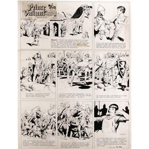 <B>Hal Foster - Prince Valiant Sunday Comic Strip Original Art, dated 9-4-49 (King Features Syndicate, 1949).</B></I> Prince Valiant proves himself to be a master tactician, as well as a brave knight, in this beautifully staged battle sequence. Val and his friends hold their ground against an overwhelming onslaught by an army of Picts by striking wounding blows rather than killing ones. This terrific Sunday is a prime example of Hal Foster's detailed storytelling, and one that is certain to be a treasured showpiece for any original art collector. This strip has an approximate image area measuring 24" x 34". The strip was cut between panel tiers one and two; other than a missing lettering correction in panel one, the art is in Excellent condition.