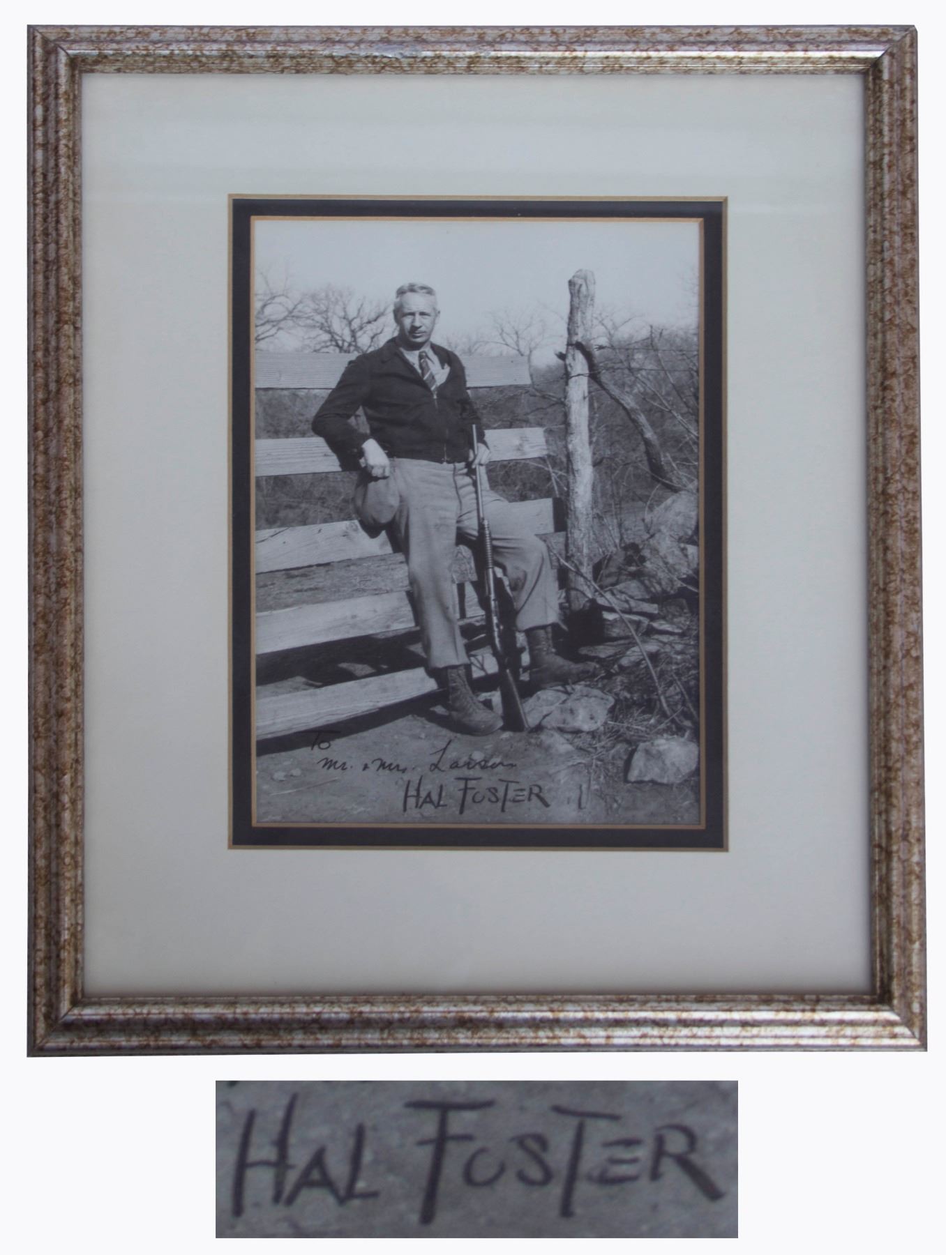 Hal Foster signed photo. The ''Prince Valiant'' creator poses outside with a sportsman's rifle, signing, ''To Mr. & Mrs. Larson / Hal Foster''. Photo measures 5'' x 7'', framed to 9.5'' x 11.5''. Not examined out of frame, but appears near fine.