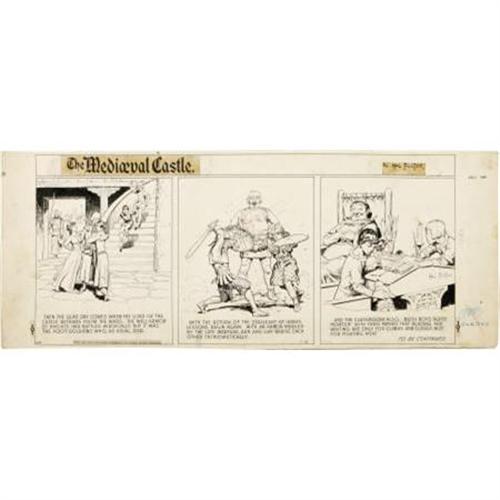 <B>Hal Foster - The Medieval Castle #64 Sunday Comic Strip Original Art, dated 7-8-45 (King Features Syndicate, 1945).</B></I> Two young, would-be knights, Arn and Guy, have at it in this beautifully drawn episode. The Medieval Castle ran for approximately 18 months and 83 episodes. The strip was run as a companion tier below Prince Valiant (for strips #376-459), and was collected for a book by Hastings House in 1957. Hal Foster is considered by many fans to be the finest adventure cartoonist ever. His classical sense of design, lush rendering, and insistence on historical accuracy have conjured up a thrilling blend of action-adventure and humorous fantasy. This strip has an image area that measures approximately 24" x 11", and the art is in Excellent condition. Hal Foster signed the final panel in blue ink, at a later date.<BR><BR><b>Shipping:</b> Flat Material, Large (<a target="_blank" href="http://www.heritageauctions.com/common/shipping.php">view shipping information</a>)