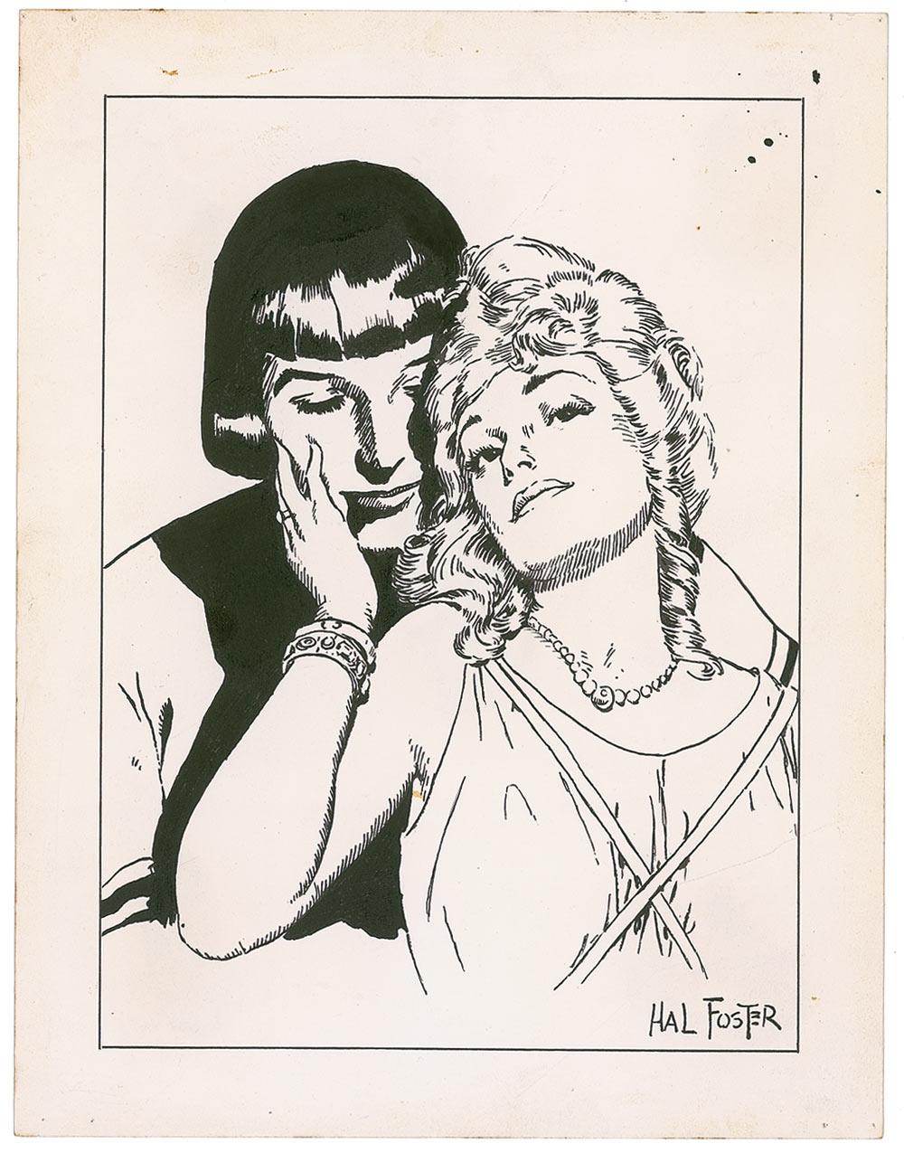 Fabulous original vintage signed ink sketch of Prince Valiant and Aleta on an off-white 8.5 x 11 card. A staple hole to each corner, some scattered light toning, and a few stray ink marks near top, otherwise fine condition.