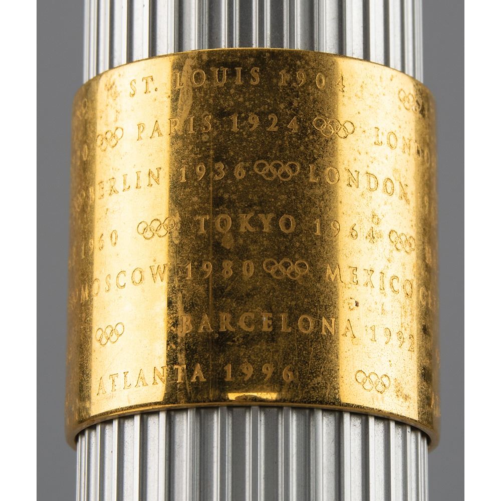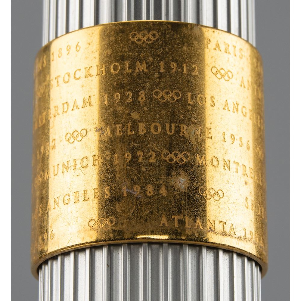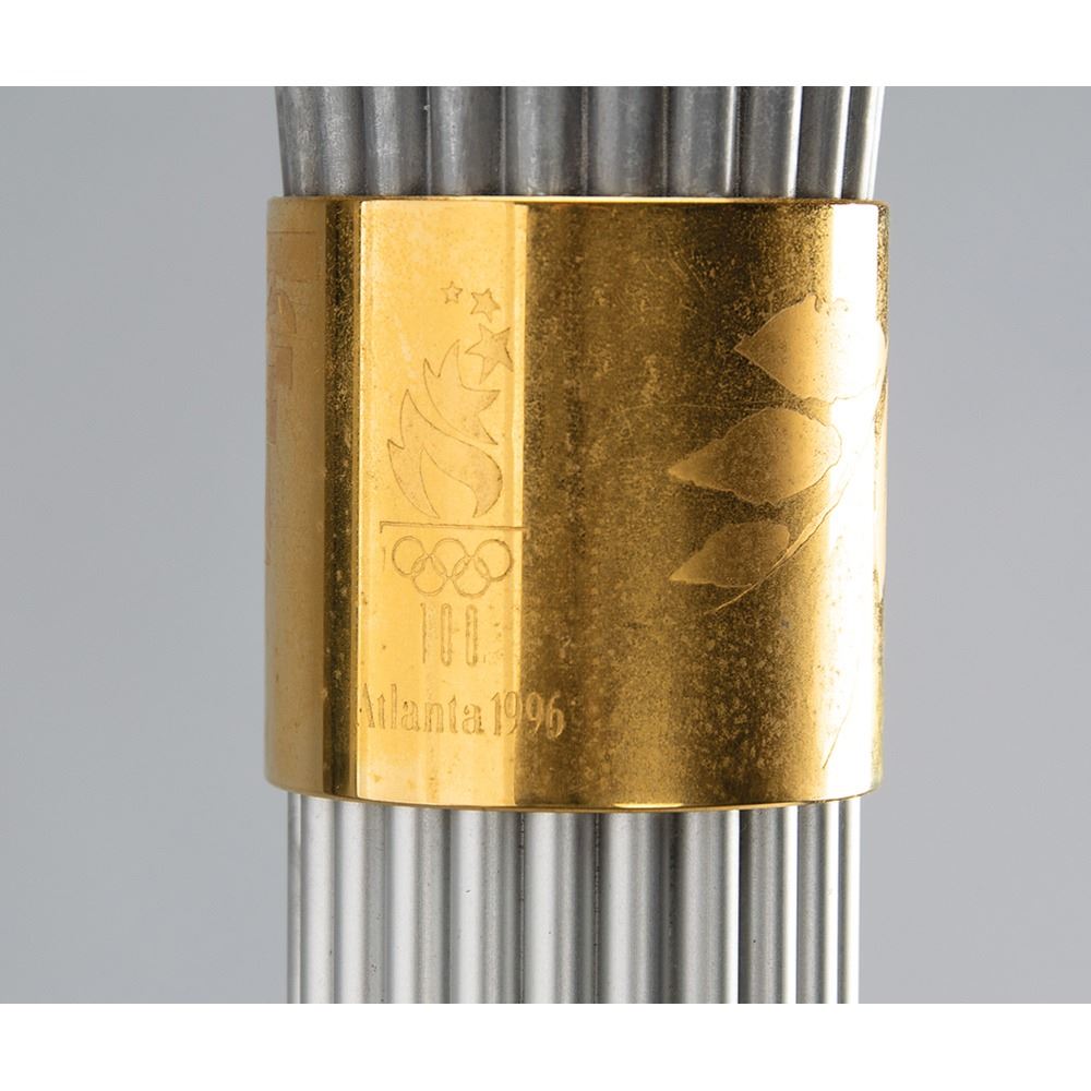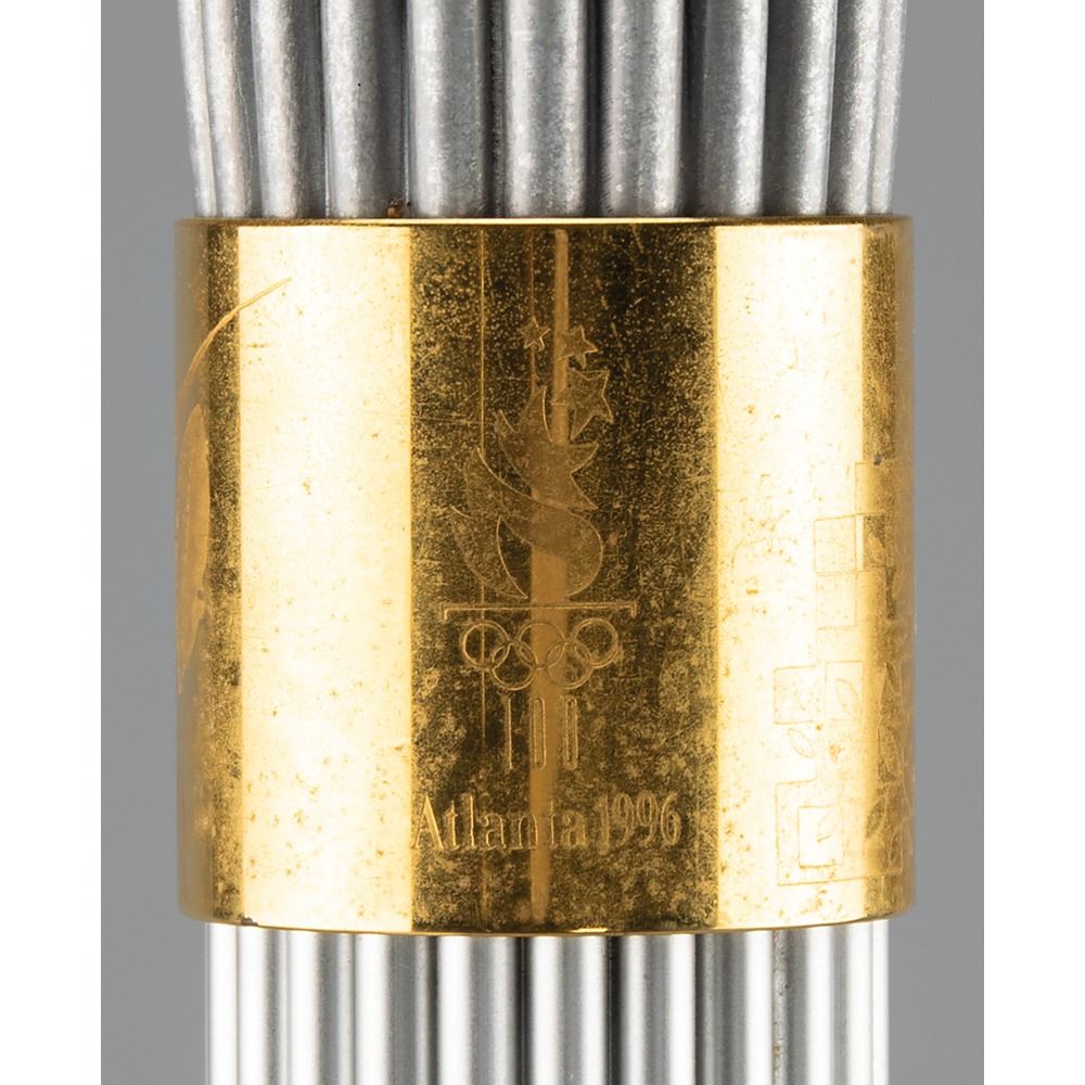 The official 1996 Atlanta Summer Olympics torch is constructed of gold-plated brass, aluminum, and Georgian pecan hardwood, and measures 31.75″ in length and 2.5″ at its widest point. Designed by Peter Mastrogiannis, the wooden handle represents the connection of the flame between heaven and earth, and the torch's twenty-two reeds, representing every host city of the Olympic Games since 1896, are gathered by bands at the top and bottom, with the top displaying the Atlanta Games logo and the quilt of leaves design, and the bottom band listing all Olympic cities and their dates since 1896. The torch relay was run from April 27 to July 19, 1996, and covered 26,875 km across the United States by over 12,000 torchbearers. Its journey included a trek on the Pony Express, a ride on the Union Pacific Railroad, and the first instance in which an Olympic relay torch made its way into space when it was carried aboard Space Shuttle Columbia as part of STS-78. Accompanied by an image of Prieste holding the offered torch during the relay.