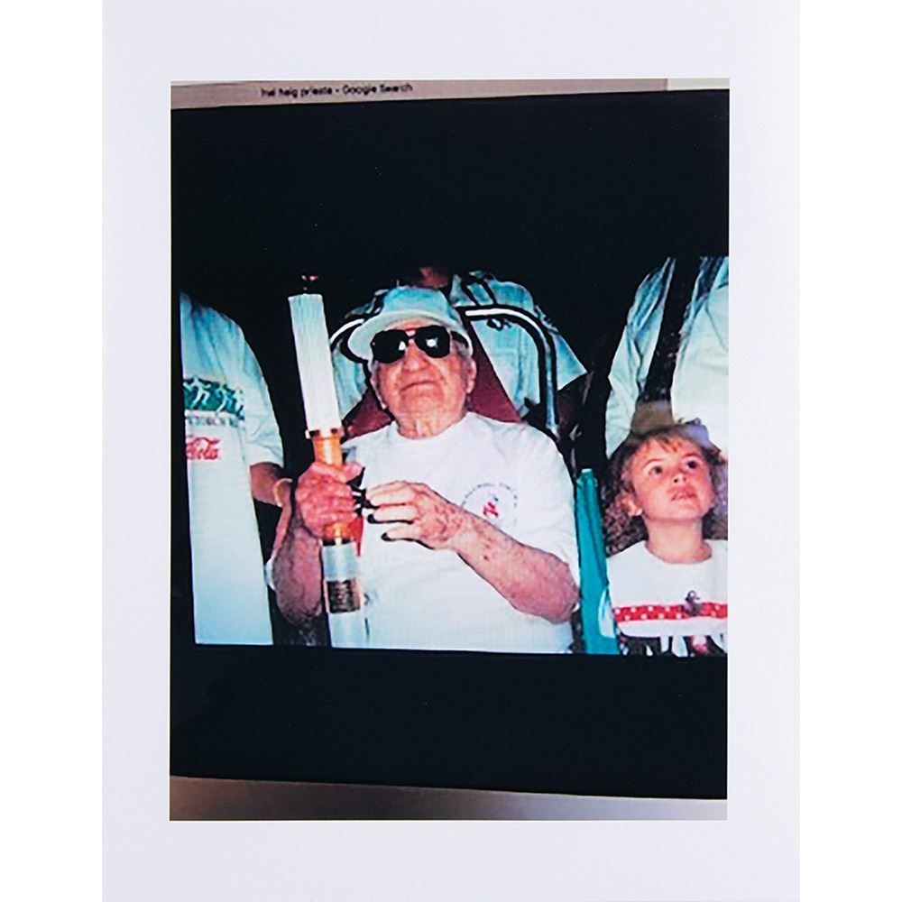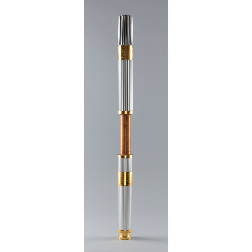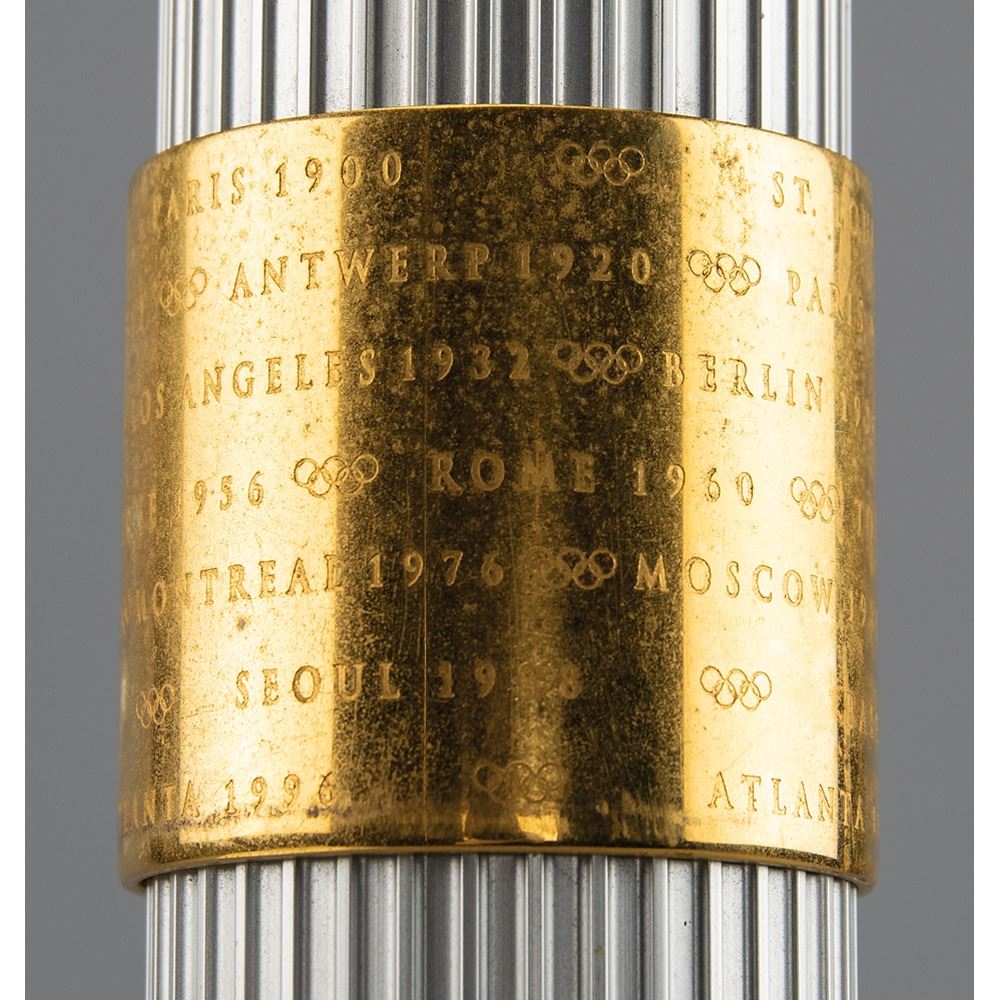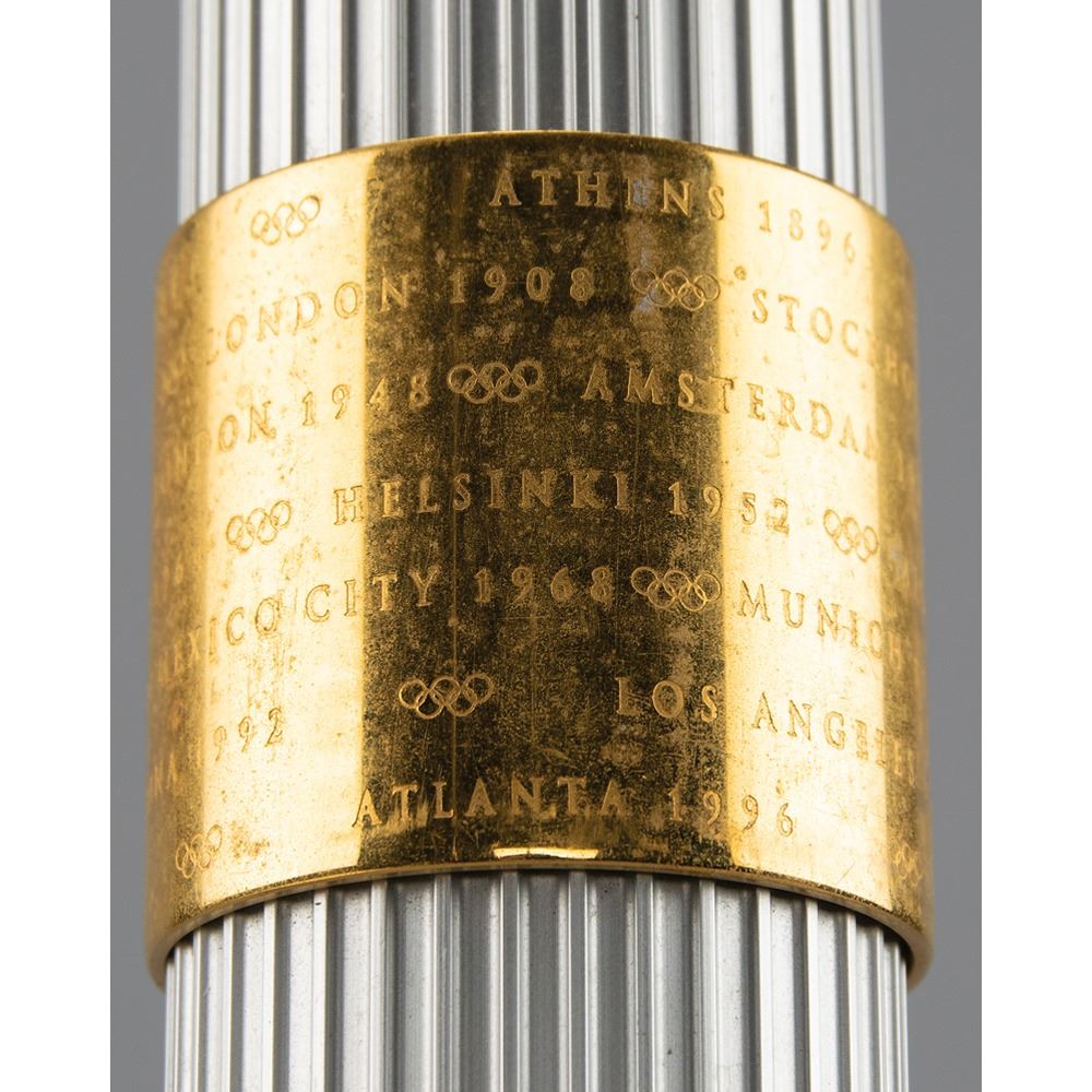 The official 1996 Atlanta Summer Olympics torch is constructed of gold-plated brass, aluminum, and Georgian pecan hardwood, and measures 31.75″ in length and 2.5″ at its widest point. Designed by Peter Mastrogiannis, the wooden handle represents the connection of the flame between heaven and earth, and the torch's twenty-two reeds, representing every host city of the Olympic Games since 1896, are gathered by bands at the top and bottom, with the top displaying the Atlanta Games logo and the quilt of leaves design, and the bottom band listing all Olympic cities and their dates since 1896. The torch relay was run from April 27 to July 19, 1996, and covered 26,875 km across the United States by over 12,000 torchbearers. Its journey included a trek on the Pony Express, a ride on the Union Pacific Railroad, and the first instance in which an Olympic relay torch made its way into space when it was carried aboard Space Shuttle Columbia as part of STS-78. Accompanied by an image of Prieste holding the offered torch during the relay.