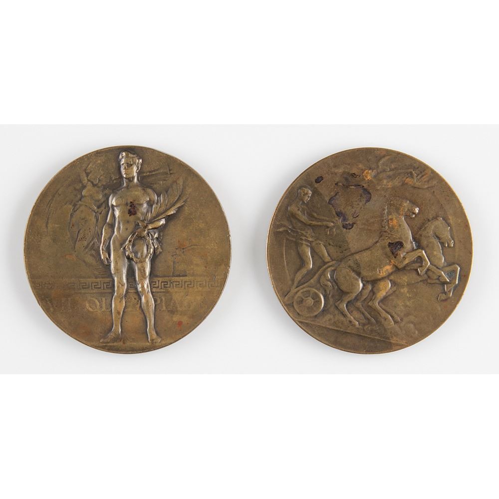 The Antwerp 1920 bronze participation medal measures 60 mm, weighs 75 gm, and was designed by Pierre Theunis. The front depicts a dramatic image of a flying Victory crowning a charioteer on biga; the reverse features Nike standing before a burning censer and crowning a trio of victorious athletes, with Antwerp in the background and raised text, "VIIme Olympiade-Anvers, MCMXX."
