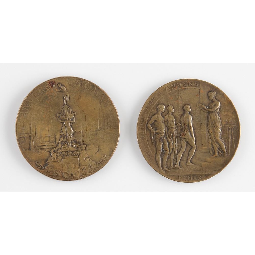 The Antwerp 1920 bronze winner's medal measures 60 mm, weighs 81 gm, and was designed by Josue Dupon. The front shows a victorious athlete holding a laurel wreath and palm branch, with a statue of Renommee in the background, inscribed "VII Olympiade"; the reverse depicts the Brabo fountain above the Antwerp shield, with the Cathedral of Our Lady and city looming in the background, inscribed above, "Anvers MCMXX."