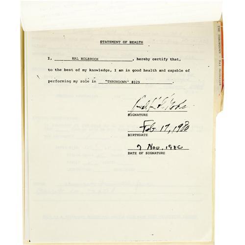 <B>Hal Holbrook "Killing of Randy Webster" Signed Contract Archive.</B></I> Includes a contract for the 1981 TV movie signed by Holbrook, publicity stills with negatives, a copy of the master production script, press clippings, a VHS screener of the movie, and a promotional movie brochure. Items are in overall Very Fine condition with mild wear.<BR><BR><b>Shipping:</b> Flat Material, Large (<a target="_blank" href="http://www.heritageauctions.com/common/shipping.php">view shipping information</a>) <BR><BR><B>Important notice: