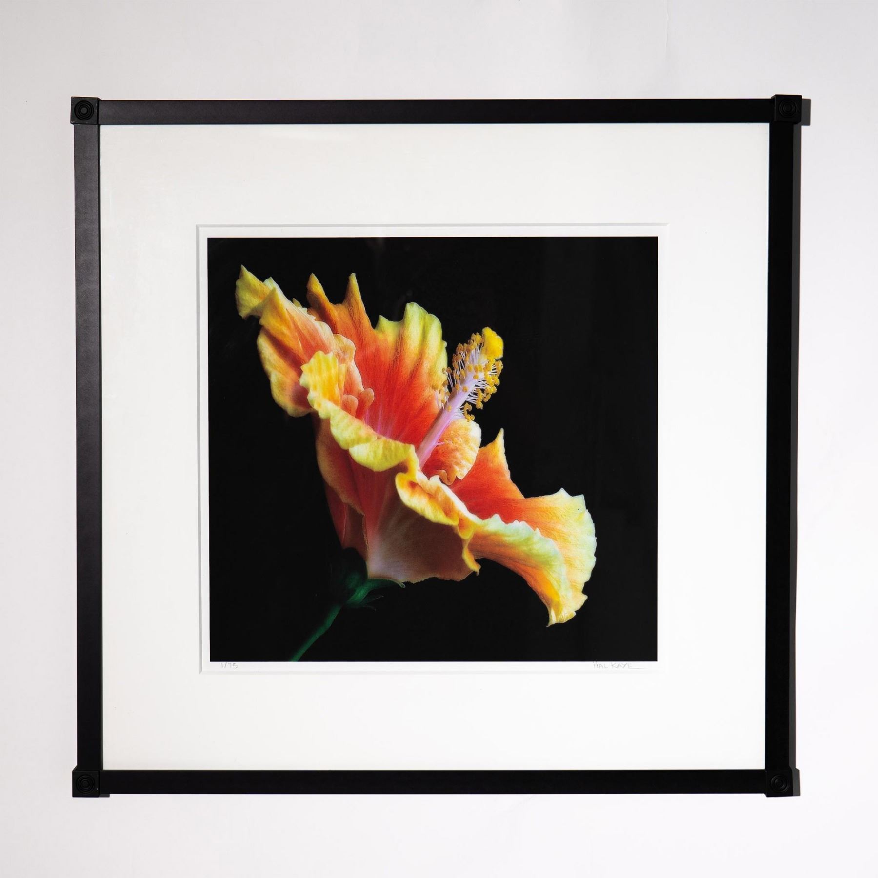 Superb original color photograph on paper entitled Chinese Hibiscus I by American artist Hal Kaye who worked in Miami from the 1950s to the 1970s as a fashion, advertising, and celebrities photographer. Kaye captures a close-up of a vibrant orange-yellow hibiscus set on a deep black background. Housed in a black frame with a white mat. Signature in graphite on lower right: Hal Kaye. Edition on lower left: 1/75. Photograph dimensions: 17.25"L x 16.50"H. Frame dimensions: 27"L x 26.25"H x 1"W. Artwork can be unframed and rolled for shipment.