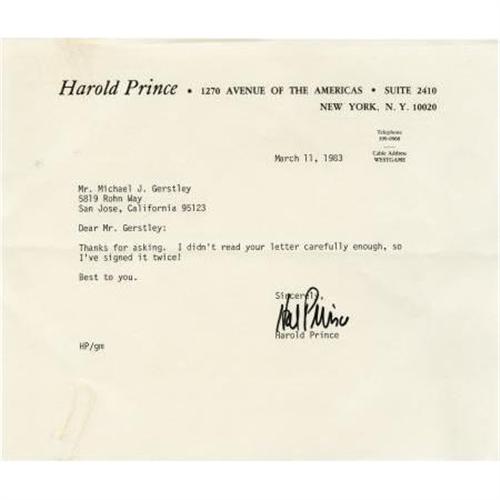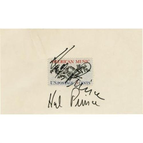 <B>Hal Prince Autographs.</B></I> A 5" x 3" card, with a five-cent commemorative postage stamp affixed, signed twice by the multiple Oscar-winning songwriter in black ink. Prince's autograph extends across the face of the stamp and is accompanied by an additional signature beneath. Also accompanying the lot is a letter, on Prince's letterhead, regarding the autograph, and signed by Prince in black ink. In Excellent condition with minor age-toning, a small center crease to letter, and paperclip impressions on both the card and letter.<BR><BR><b>Shipping:</b> Flat Material, Small (<a target="_blank" href="http://www.heritageauctions.com/common/shipping.php">view shipping information</a>)