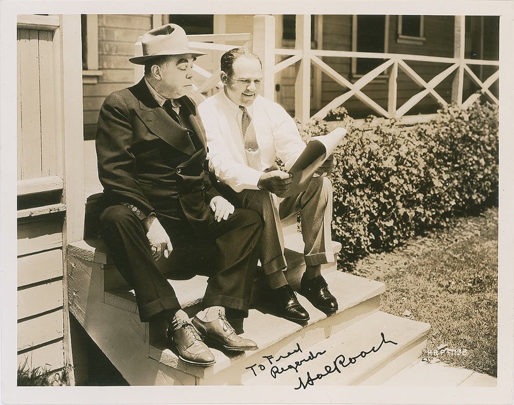 Successful American picture producer (1892–1992) best known for his association with Laurel and Hardy and the Our Gang series of films. Fantastic vintage sepia glossy 10 x 8 Stax Graves publicity photo of the producer going over the script for Fisherman’s Luck with Irvin Cobb, boldly signed and inscribed in black ink “To Fred, Regards, Hal Roach.” Reverse bears promotional information and an official stamp from Hal Roach’s studio photographer “Stax.” In fine condition, with small tear to lower border repaired on the reverse, slight curling to horizontal edges, and a few scattered creases.