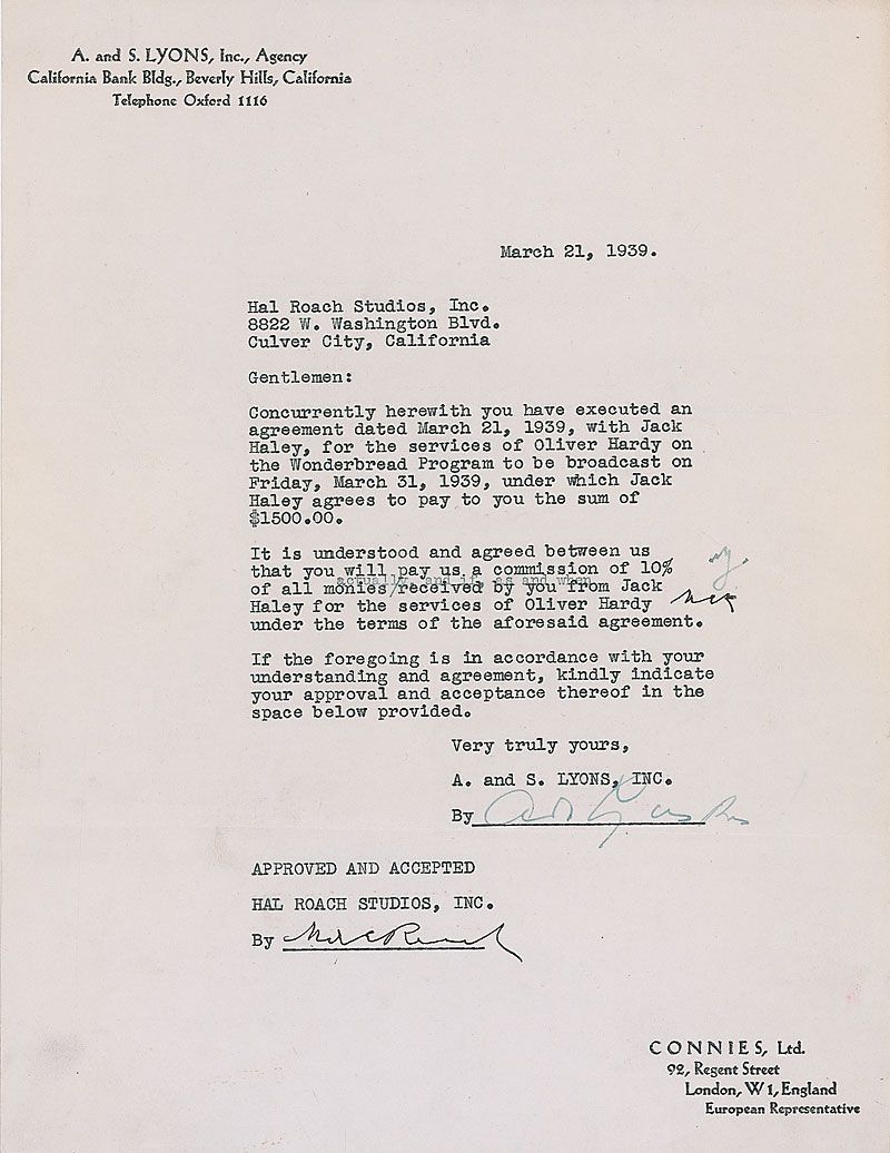 DS, signed “Hal E. Roach,” one page, 8.5 x 11, March 21, 1939. Roach confirms an agreement “with Jack Haley, for the services of Oliver Hardy on the Wonderbread Program to be broadcast on Friday, March 31, 1939.” Signed at the conclusion by Roach and an agency representative. A change to the main text has also been initialed by Roach. In fine condition.