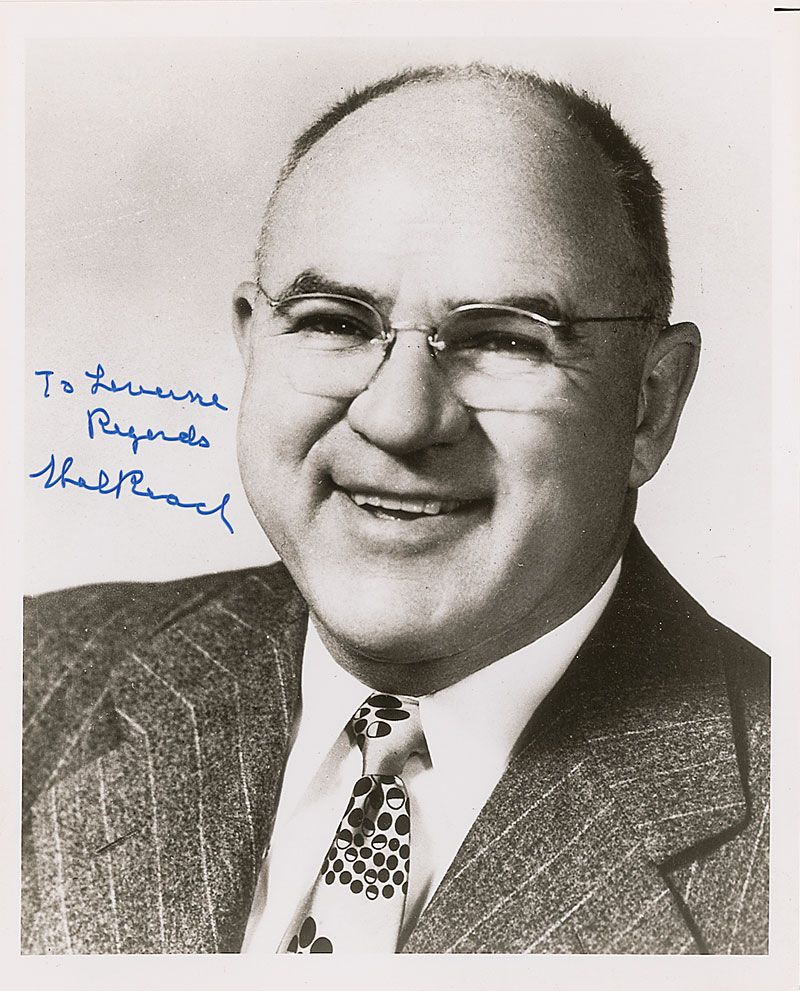 Glossy 8 x 9.75 photo of the famous producer, signed and inscribed in blue felt tip, “To LaVerne, Regards, Hal Roach.” In fine condition.
