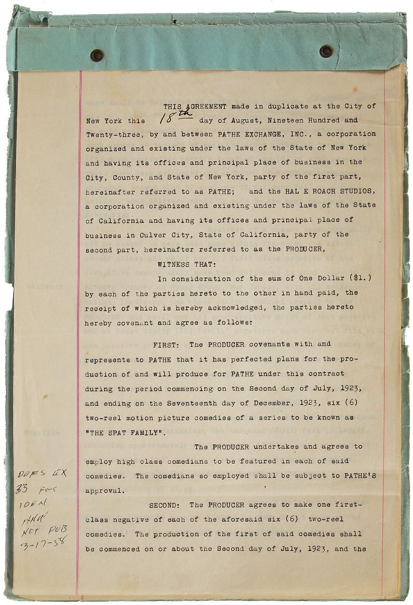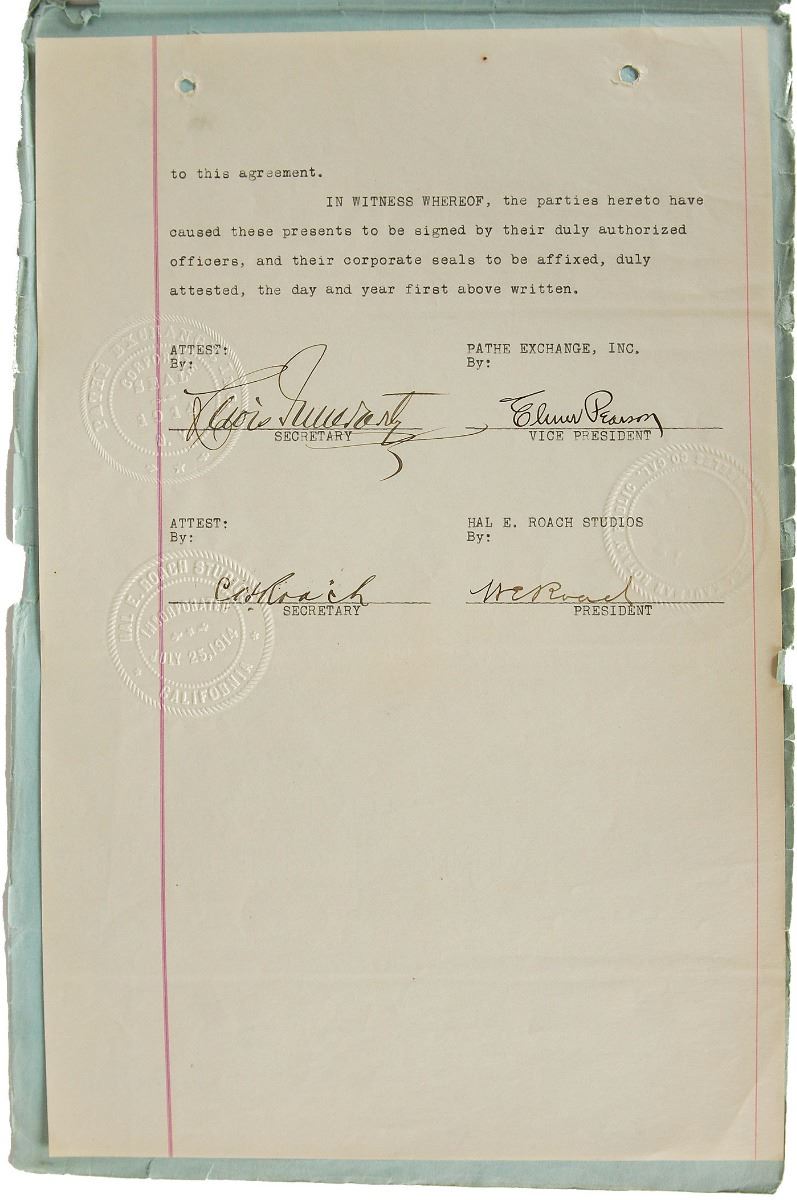 DS, signed “H. E. Roach,” twenty pages, 8.5 x 13.5, August 18, 1923. Agreement between Hal E. Roach Studios and the Pathe Exchange for the production of “six (6) two-reel motion picture comedies of a series to be known as ‘The Spat Family.’” Signed on the last page in fountain by Roach and officials from both companies. In fine condition, with expected document wear.