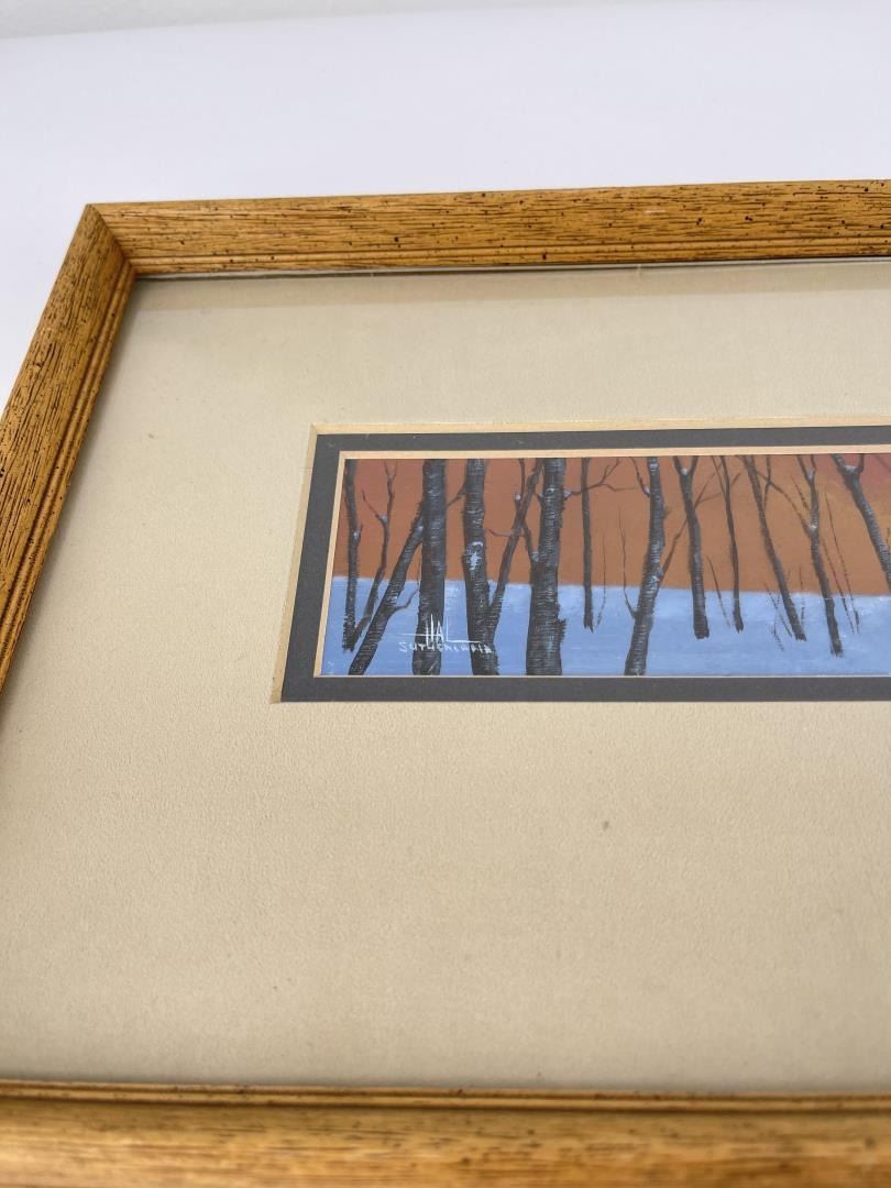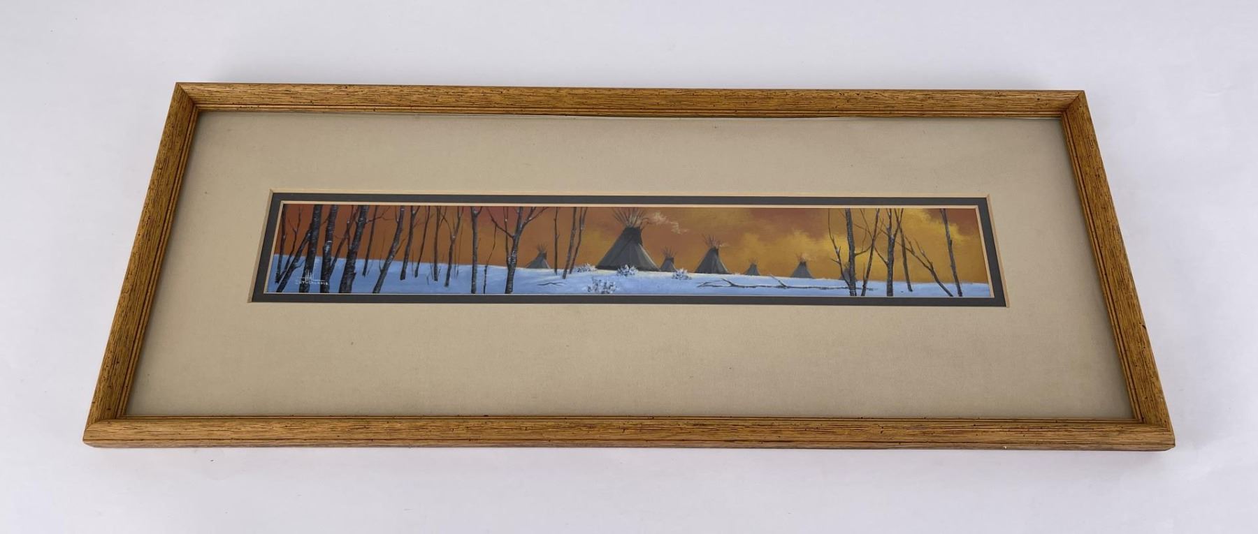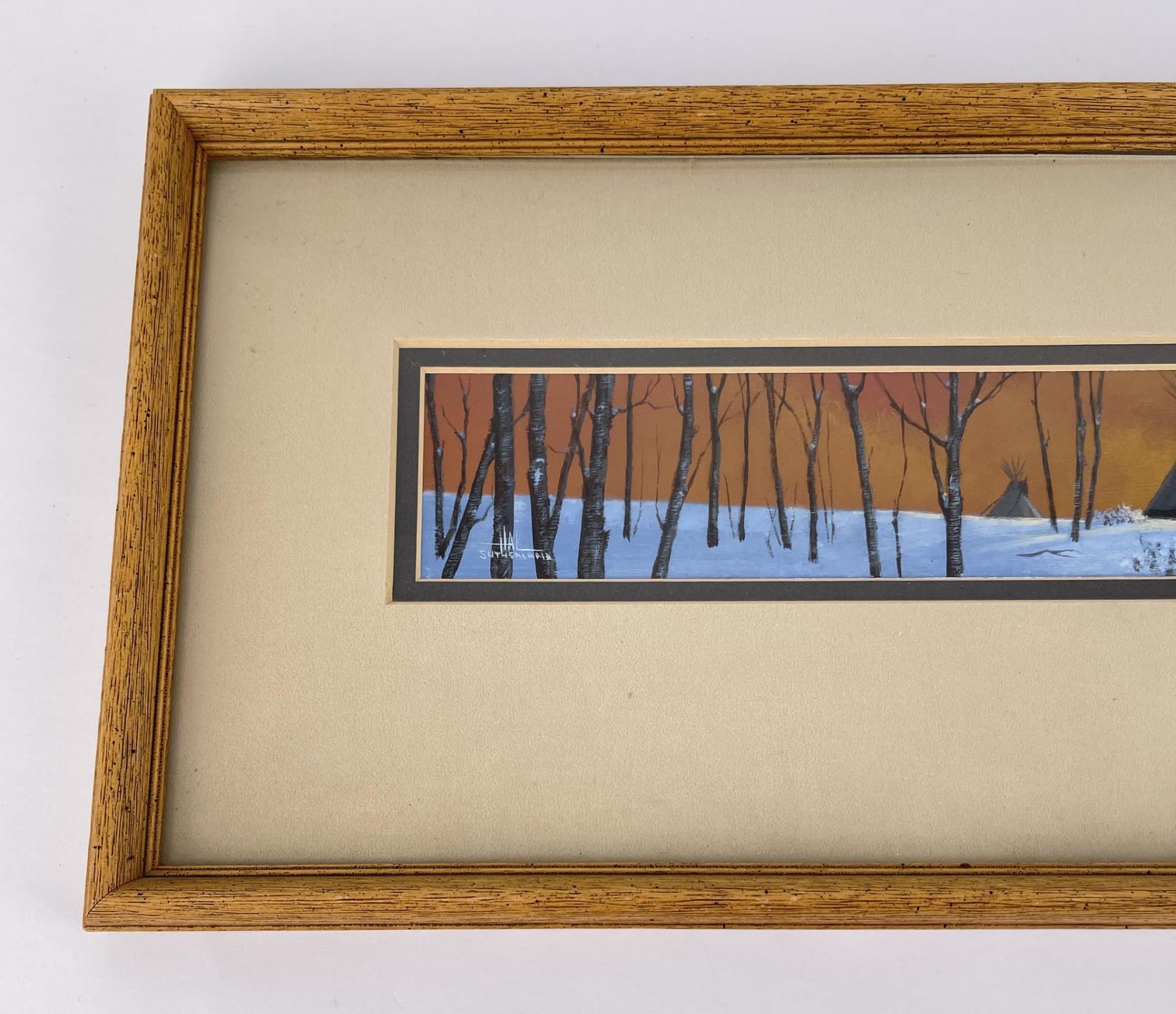 Gouache on paper. 8 1/2" by 22" framed. Title is Winter Gold Hal Sutherland (Born 1929) is active/lives in Washington. Hal Sutherland is known for Super realist figure, western. A resident of Bothell, Washington, he paints acrylic scenes of early pioneers and Native Americans, often with humorous touches. Allard Auction Collection Inv: HUY 21214